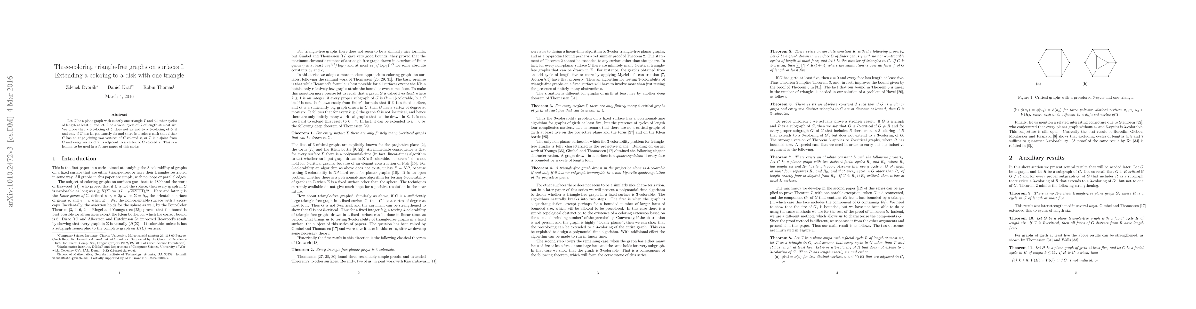 This paper proves that for a plane graph with a single triangle and longer cycles, a 3-coloring of a six-cycle face either extends to the entire graph or fails due to specific coloring constraints involving the triangle and the cycle. This result serves as a foundational lemma for subsequent research on three-coloring triangle-free graphs.