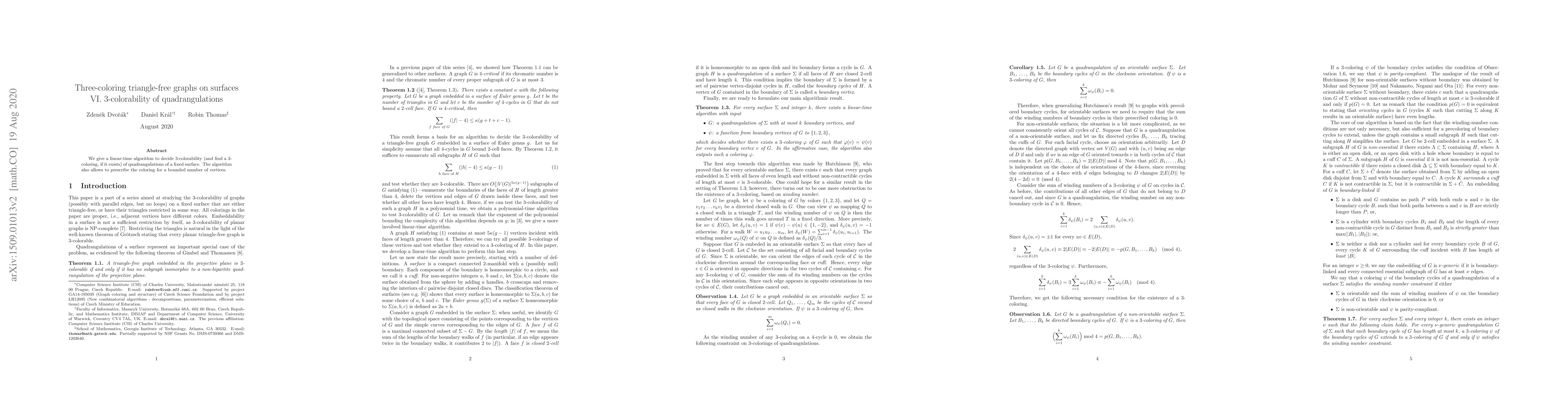 We give a linear-time algorithm to decide 3-colorability (and find a 3-coloring, if it exists) of quadrangulations of a fixed surface. The algorithm also allows to prescribe the coloring for a bounded number of vertices.