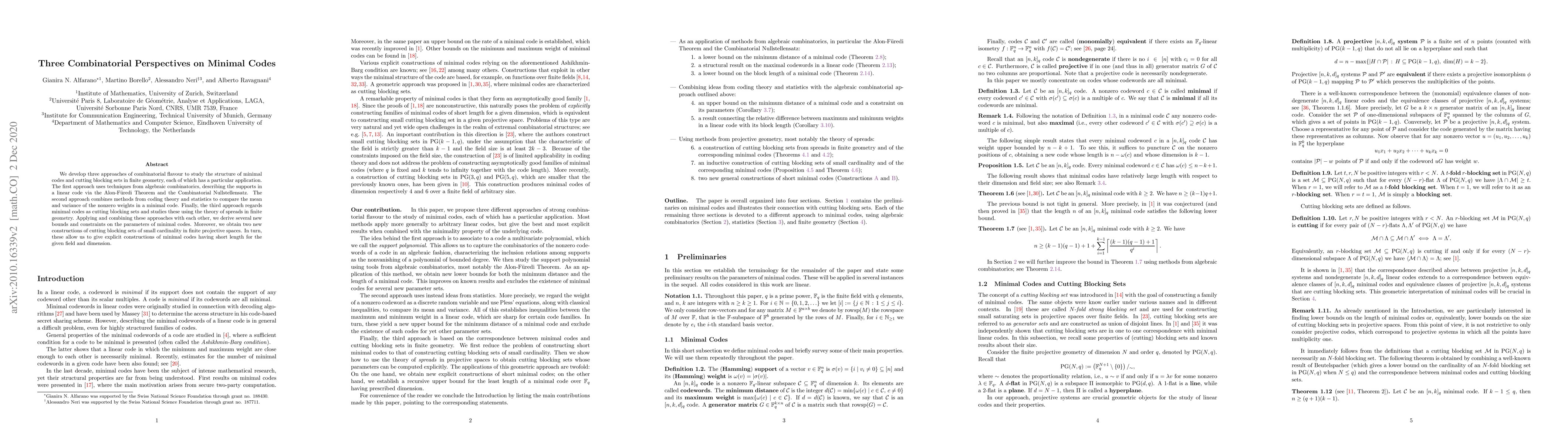 The paper introduces novel combinatorial techniques for analyzing minimal codes, combining algebraic combinatorics, coding theory, and finite geometry, leading to new bounds and constructions.