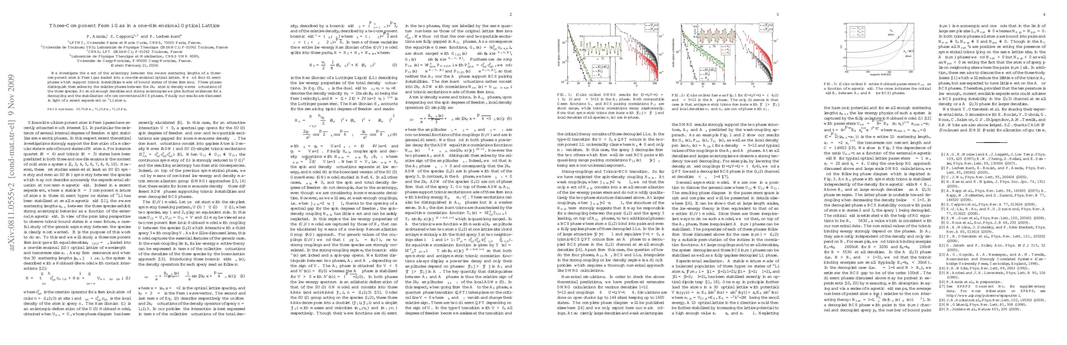 This paper explores the phases of a three-component Fermi gas in a one-dimensional optical lattice, identifying four distinct phases characterized by trionic instabilities and fluctuations in atomic density waves. At low densities or strong anisotropies, the study finds evidence for decoupling and stabilization of BCS phases, with implications for recent experiments on $^{6}$Li atoms.