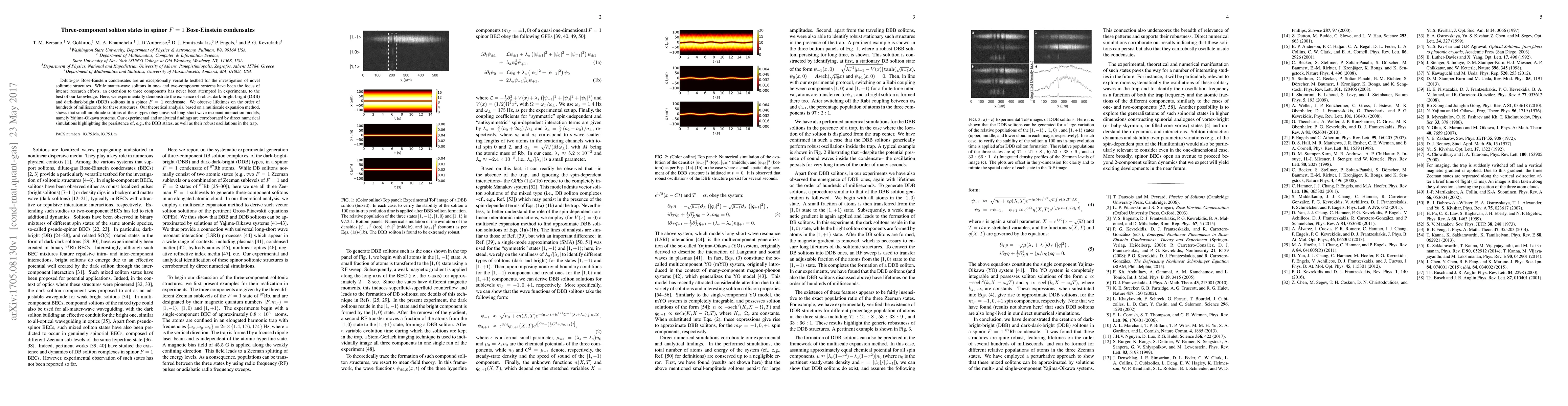 Dilute-gas Bose-Einstein condensates are an exceptionally versatile testbed for the investigation of novel solitonic structures. While matter-wave solitons in one- and two-component systems have been the focus of intense research efforts, an extension to three components has never been attempted in experiments, to the best of our knowledge. Here, we experimentally demonstrate the existence of robust dark-bright-bright (DBB) and dark-dark-bright (DDB) solitons in a spinor $F=1$ condensate. We observe lifetimes on the order of hundreds of milliseconds for these structures. Our theoretical analysis, based on a multiscale expansion method, shows that small-amplitude solitons of these types obey universal long-short wave resonant interaction models, namely Yajima-Oikawa systems. Our experimental and analytical findings are corroborated by direct numerical simulations highlighting the persistence of, e.g., the DBB states, as well as their robust oscillations in the trap.
