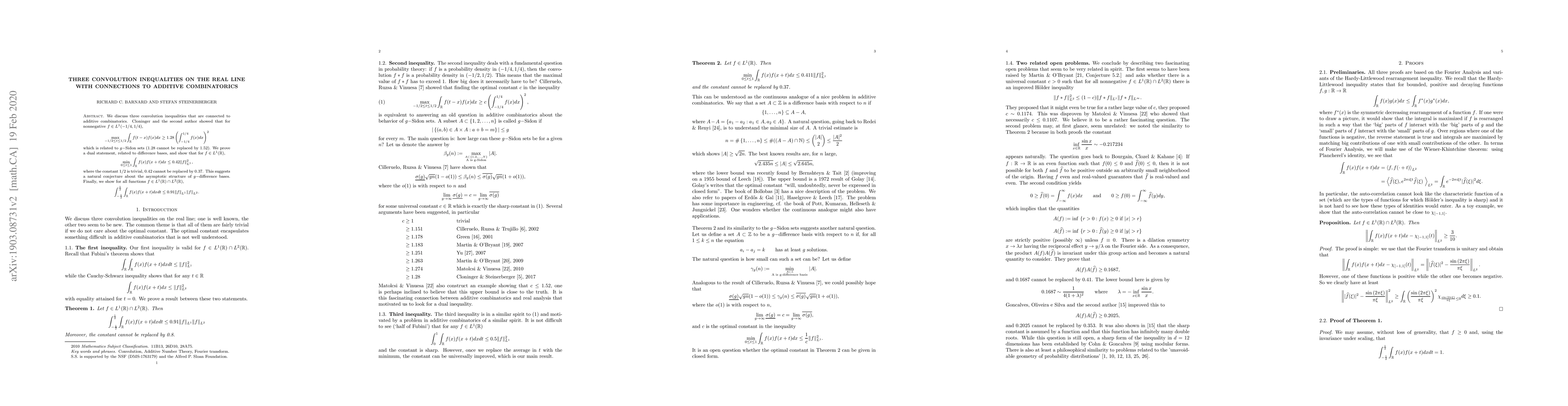 We discuss three convolution inequalities that are connected to additive combinatorics. Cloninger and the second author showed that for nonnegative $f \in L^1(-1/4, 1/4)$, $$ \max_{-1/2 \leq t \leq 1/2} \int_{\mathbb{R}}{f(t-x) f(x) dx} \geq 1.28 \left( \int_{-1/4}^{1/4}{f(x) dx}\right)^2$$ which is related to $g-$Sidon sets (1.28 cannot be replaced by 1.52). We prove a dual statement, related to difference bases, and show that for $f \in L^1(\mathbb{R})$, $$ \min_{0 \leq t \leq 1}\int_{\mathbb{R}}{f(x) f(x+t) dx} \leq 0.42 \|f\|_{L^1}^2,$$ where the constant 1/2 is trivial, 0.42 cannot be replaced by 0.37. This suggests a natural conjecture about the asymptotic structure of $g-$difference bases. Finally, we show for all functions $f \in L^1(\mathbb{R}) \cap L^2(\mathbb{R})$, $$ \int_{-\frac{1}{2}}^{\frac{1}{2}}{ \int_{\mathbb{R}}{f(x) f(x+t) dx}dt} \leq 0.91 \|f\|_{L^1}\|f\|_{L^2}$$