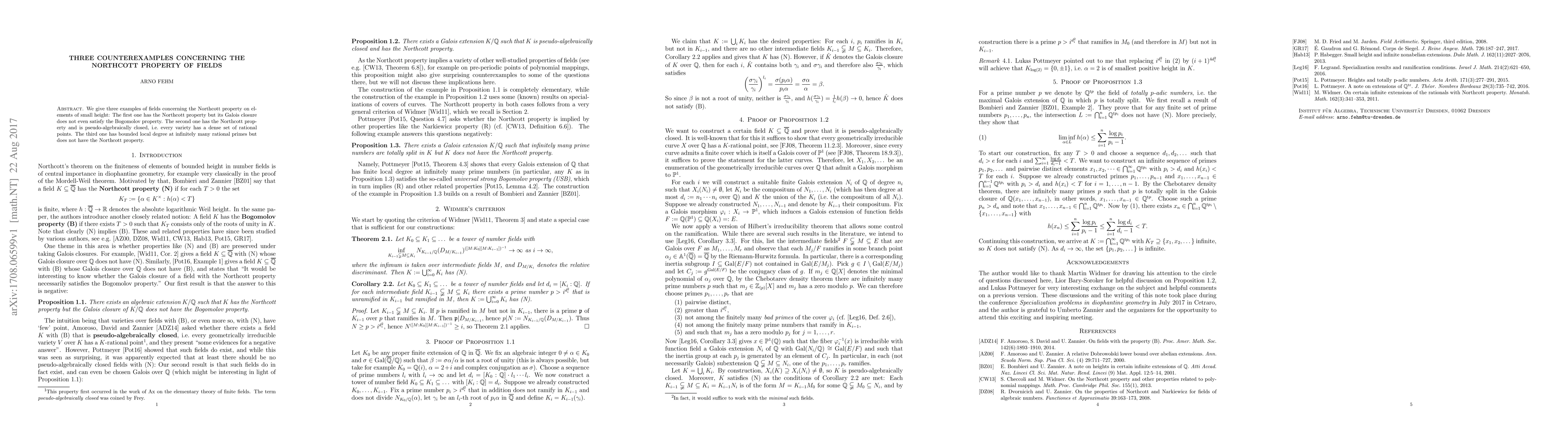 We give three examples of fields concerning the Northcott property on elements of small height: The first one has the Northcott property but its Galois closure does not satisfy the Bogomolov property. The second one has the Northcott property and is pseudo-algebraically closed, i.e. every variety has a dense set of rational points. The third one has bounded local degree at infinitely many rational primes but does not have the Northcott property.