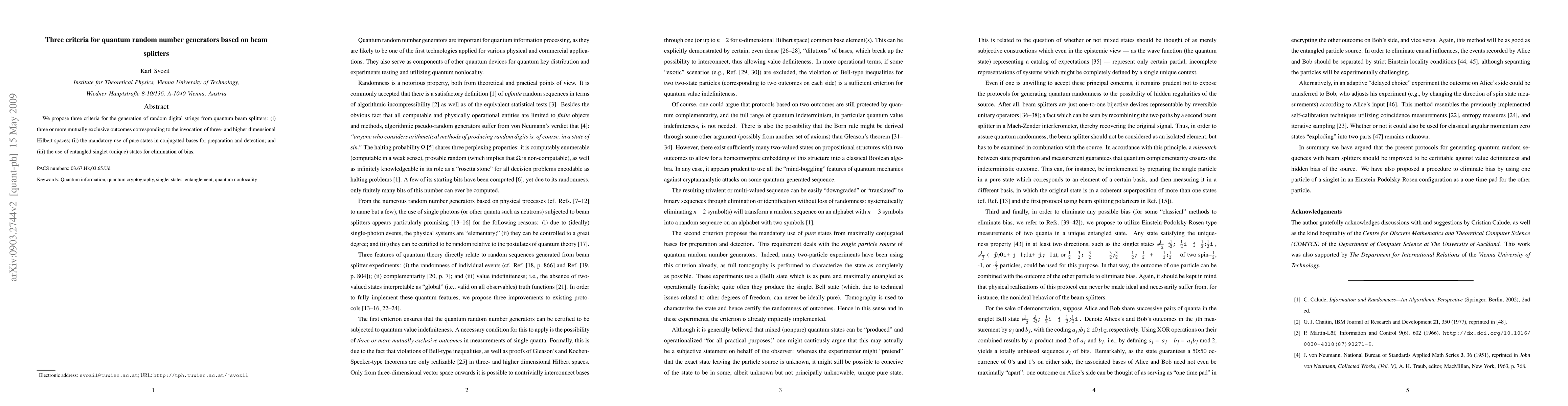 We propose three criteria for the generation of random digital strings from quantum beam splitters: (i) three or more mutually exclusive outcomes corresponding to the invocation of three- and higher dimensional Hilbert spaces; (ii) the mandatory use of pure states in conjugated bases for preparation and detection; and (iii) the use of entangled singlet (unique) states for elimination of bias.