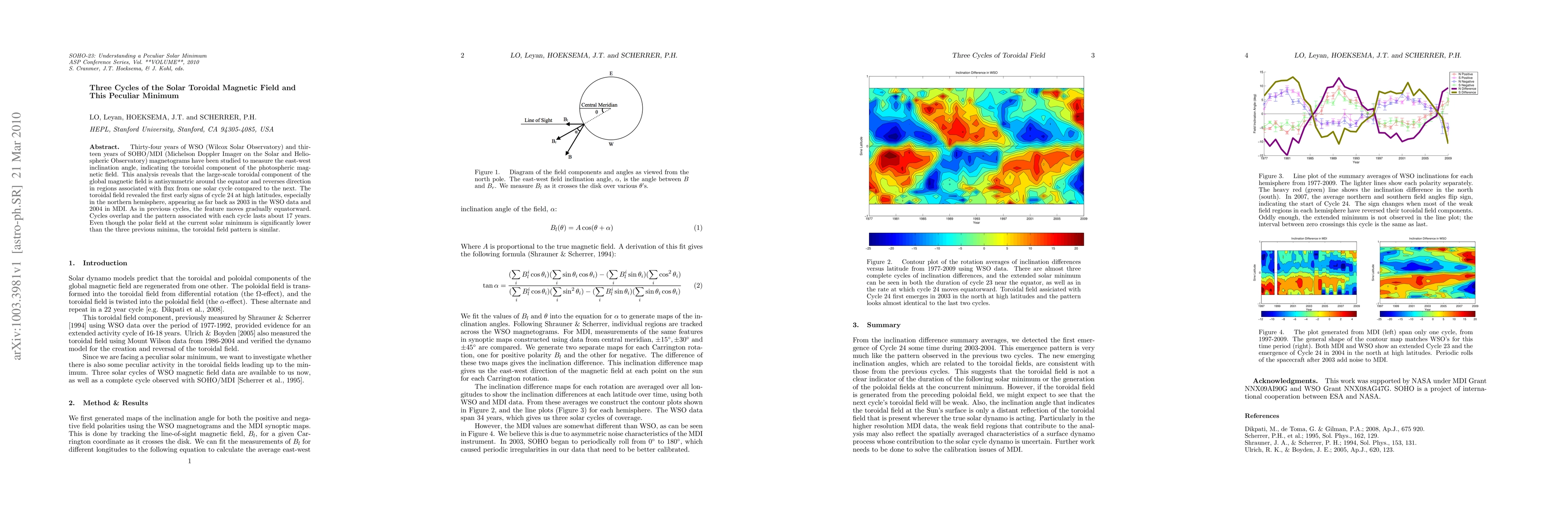 Thirty-four years of WSO (Wilcox Solar Observatory) and thirteen years of SOHO/MDI (Michelson Doppler Imager on the Solar and Heliospheric Observatory) magnetograms have been studied to measure the east-west inclination angle, indicating the toroidal component of the photospheric magnetic field. This analysis reveals that the large-scale toroidal component of the global magnetic field is antisymmetric around the equator and reverses direction in regions associated with flux from one solar cycle compared to the next. The toroidal field revealed the first early signs of cycle 24 at high latitudes, especially in the northern hemisphere, appearing as far back as 2003 in the WSO data and 2004 in MDI. As in previous cycles, the feature moves gradually equatorward. Cycles overlap and the pattern associated with each cycle lasts about 17 years. Even though the polar field at the current solar minimum is significantly lower than the three previous minima, the toroidal field pattern is similar.