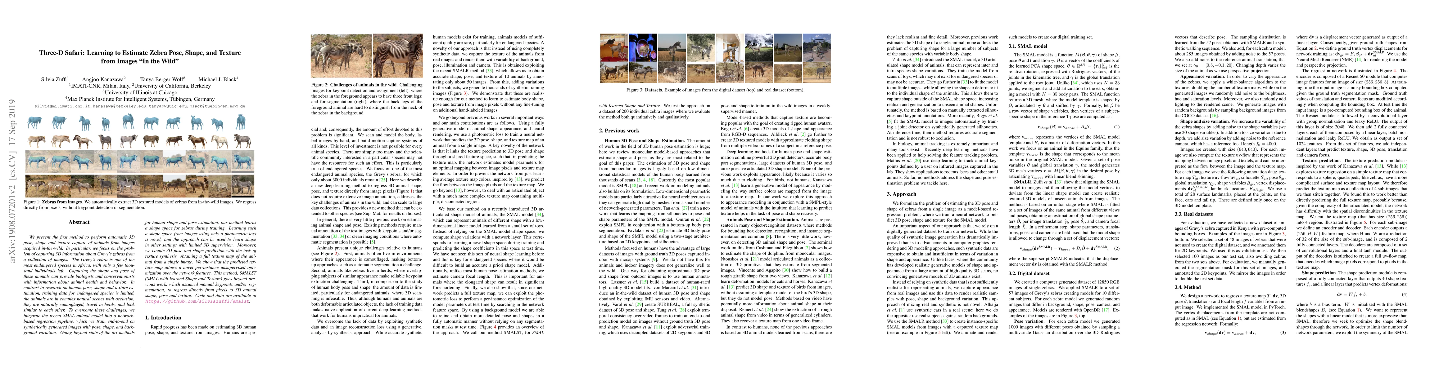 We present the first method to perform automatic 3D pose, shape and texture capture of animals from images acquired in-the-wild. In particular, we focus on the problem of capturing 3D information about Grevy's zebras from a collection of images. The Grevy's zebra is one of the most endangered species in Africa, with only a few thousand individuals left. Capturing the shape and pose of these animals can provide biologists and conservationists with information about animal health and behavior. In contrast to research on human pose, shape and texture estimation, training data for endangered species is limited, the animals are in complex natural scenes with occlusion, they are naturally camouflaged, travel in herds, and look similar to each other. To overcome these challenges, we integrate the recent SMAL animal model into a network-based regression pipeline, which we train end-to-end on synthetically generated images with pose, shape, and background variation. Going beyond state-of-the-art methods for human shape and pose estimation, our method learns a shape space for zebras during training. Learning such a shape space from images using only a photometric loss is novel, and the approach can be used to learn shape in other settings with limited 3D supervision. Moreover, we couple 3D pose and shape prediction with the task of texture synthesis, obtaining a full texture map of the animal from a single image. We show that the predicted texture map allows a novel per-instance unsupervised optimization over the network features. This method, SMALST (SMAL with learned Shape and Texture) goes beyond previous work, which assumed manual keypoints and/or segmentation, to regress directly from pixels to 3D animal shape, pose and texture. Code and data are available at https://github.com/silviazuffi/smalst.