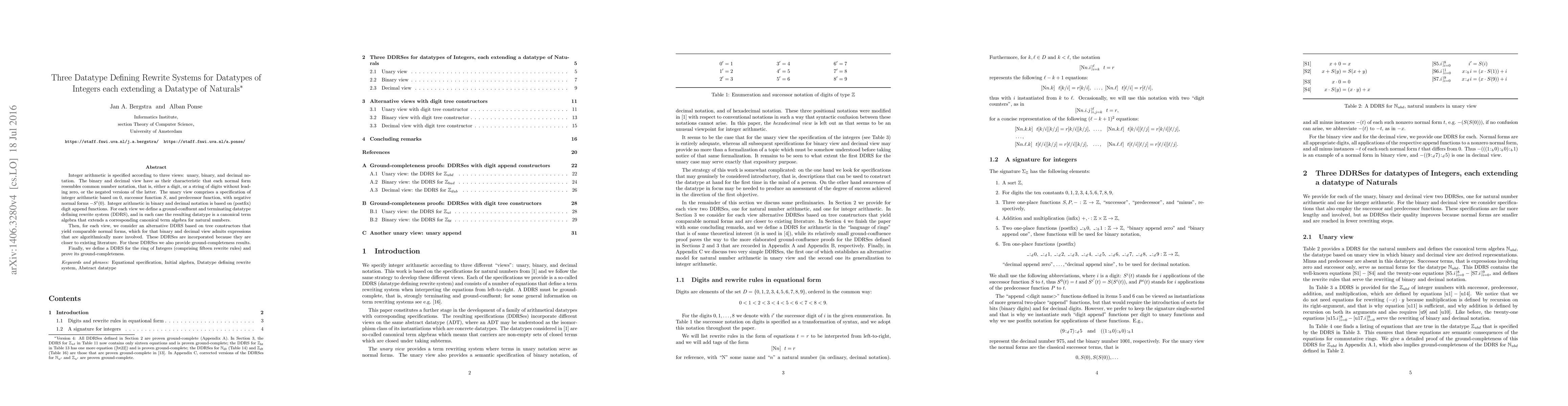 Integer arithmetic is specified according to three views: unary, binary, and decimal notation. The binary and decimal view have as their characteristic that each normal form resembles common number notation, that is, either a digit, or a string of digits without leading zero, or the negated versions of the latter. The unary view comprises a specification of integer arithmetic based on 0, successor function $S$, and predecessor function, with negative normal forms $-S^i(0)$. Integer arithmetic in binary and decimal notation is based on (postfix) digit append functions. For each view we define a ground-confluent and terminating datatype defining rewrite system (DDRS), and in each case the resulting datatype is a canonical term algebra that extends a corresponding canonical term algebra for natural numbers. Then, for each view, we consider an alternative DDRS based on tree constructors that yield comparable normal forms, which for that binary and decimal view admits expressions that are algorithmically more involved. These DDRSes are incorporated because they are closer to existing literature. For these DDRSes we also provide ground-completeness results. Finally, we define a DDRS for the ring of Integers (comprising fifteen rewrite rules) and prove its ground-completeness.