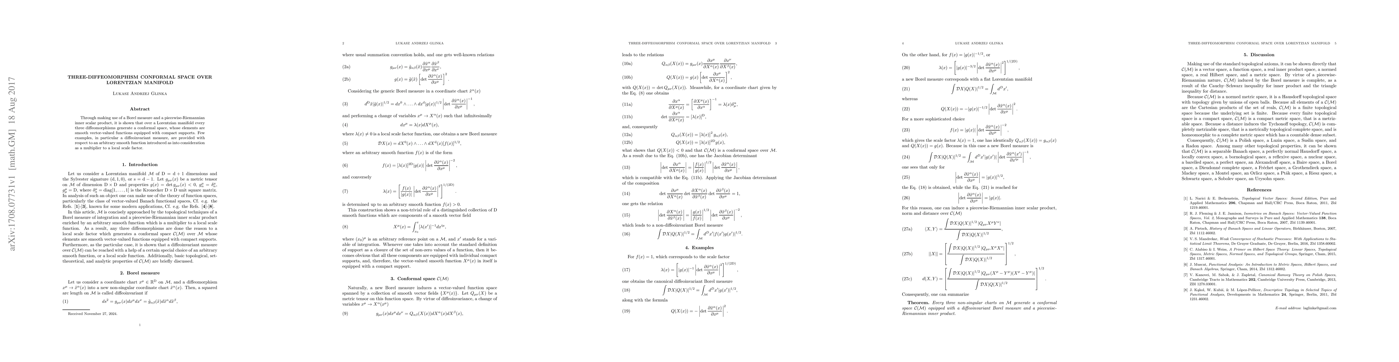 Through making use of a Borel measure and a piecewise-Riemannian inner scalar product, it is shown that over a Lorentzian manifold every three diffeomorphisms generate a conformal space, whose elements are smooth vector-valued functions equipped with compact supports. Few examples, in particular a diffeoinvariant measure, are provided with respect to an arbitrary smooth function introduced as into consideration as a multiplier to a local scale factor.
