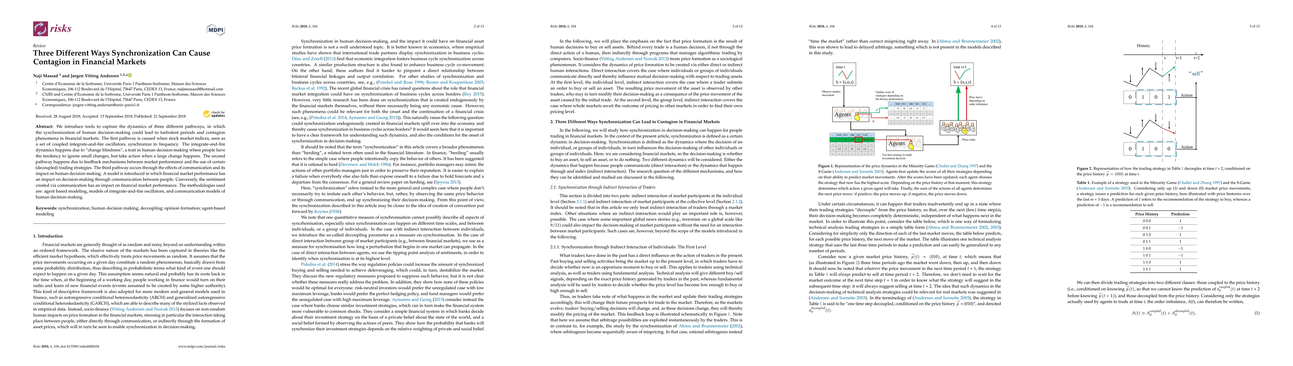 A new model suggests that synchronization in human decision-making can cause contagion in financial markets through three different pathways: frequency synchronization, feedback mechanisms, and communication effects.
