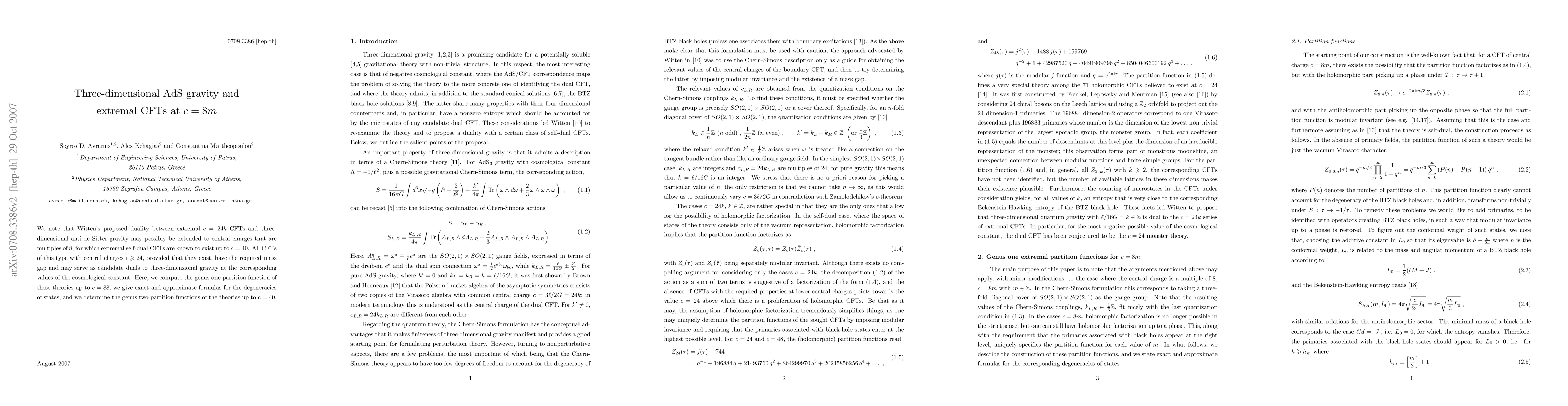 Researchers investigate a proposed duality between 3D anti-de Sitter gravity and extremal CFTs with central charges that are multiples of 8, expanding on Witten's initial proposal to include higher central charges.