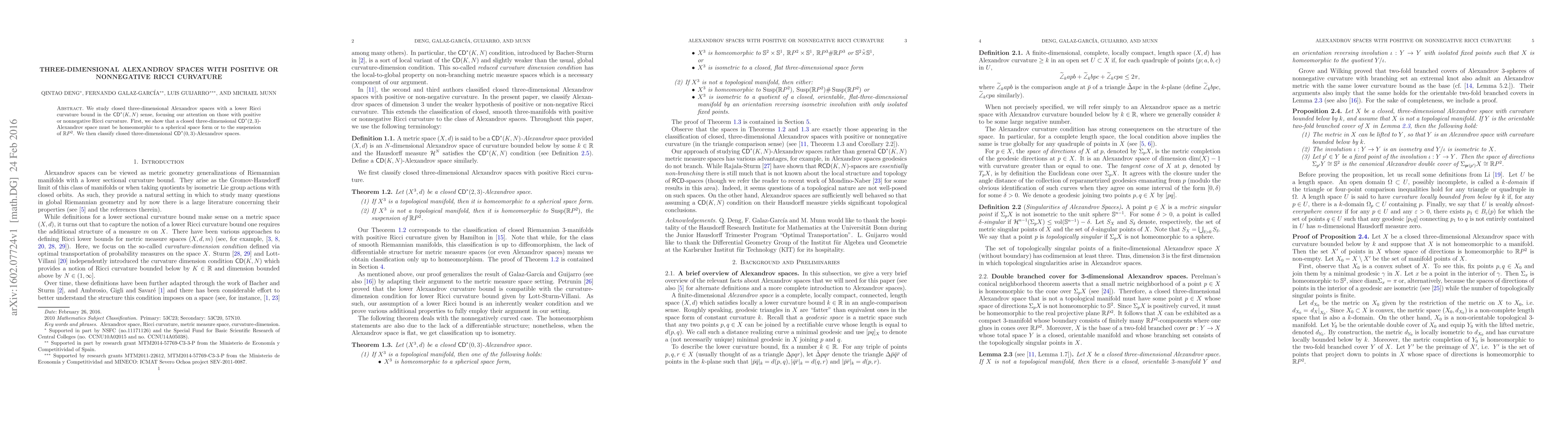 This paper investigates closed three-dimensional Alexandrov spaces with Ricci curvature bounds, showing that $\mathsf{CD}^*(2,3)$-spaces are homeomorphic to spherical space forms or suspensions of $\mathbb{R}P^2$, and classifying $\mathsf{CD}^*(0,3)$-spaces.