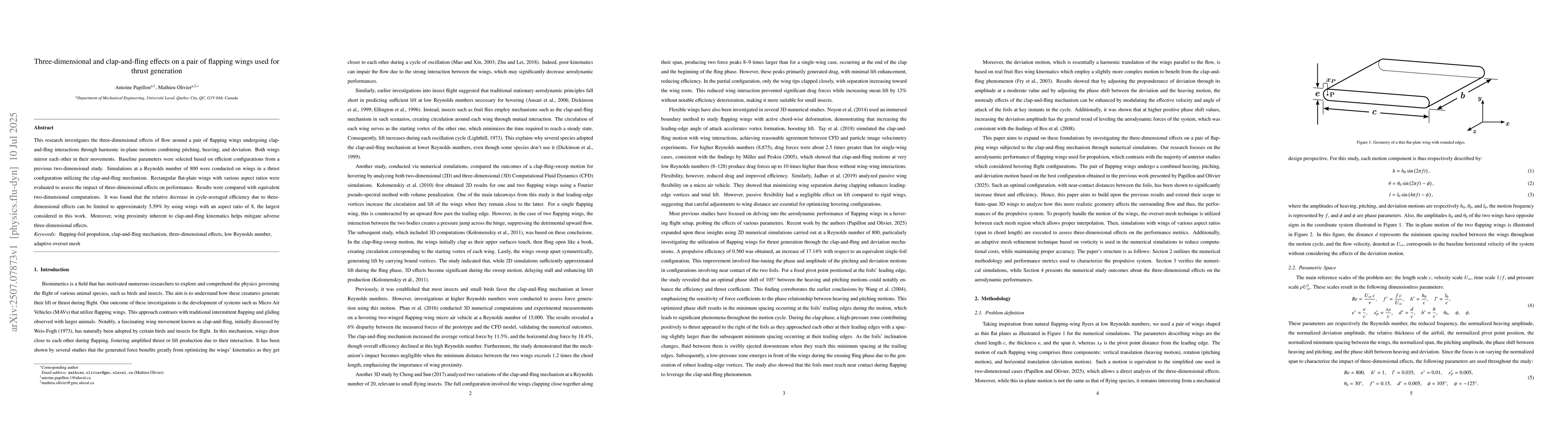 This research investigates the three-dimensional effects of flow around a pair of flapping wings undergoing clap-and-fling interactions through harmonic in-plane motions combining pitching, heaving, and deviation. Both wings mirror each other in their movements. Baseline parameters were selected based on efficient configurations from a previous two-dimensional study. Simulations at a Reynolds number of 800 were conducted on wings in a thrust configuration utilizing the clap-and-fling mechanism. Rectangular flat-plate wings with various aspect ratios were evaluated to assess the impact of three-dimensional effects on performance. Results were compared with equivalent two-dimensional computations. It was found that the relative decrease in cycle-averaged efficiency due to three-dimensional effects can be limited to approximately 5.59% by using wings with an aspect ratio of 8, the largest considered in this work. Moreover, wing proximity inherent to clap-and-fling kinematics helps mitigate adverse three-dimensional effects.