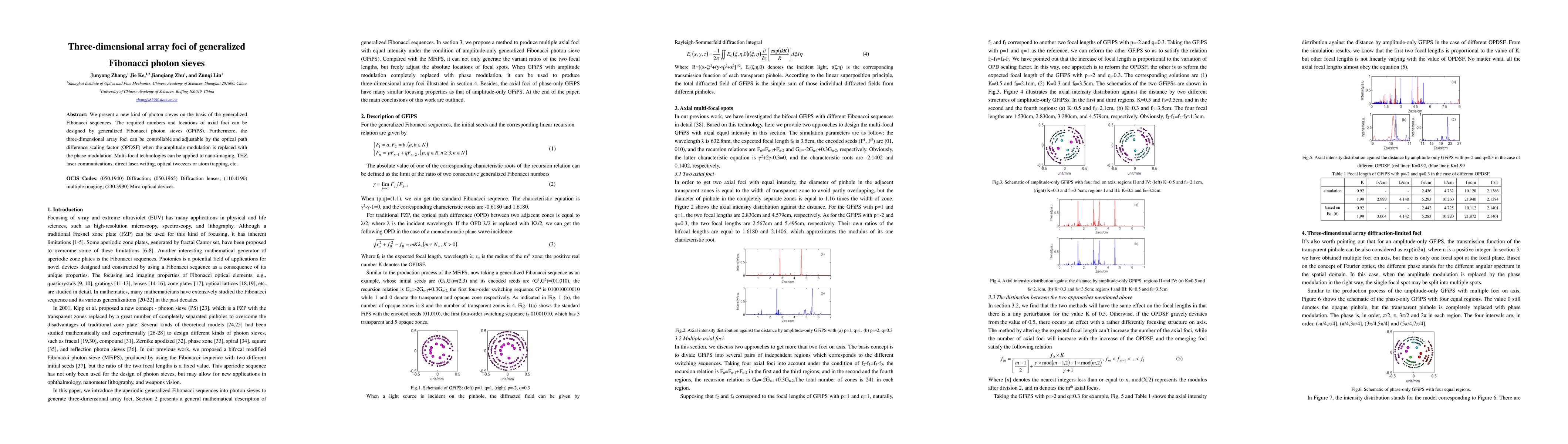 This paper introduces a novel photon sieve based on generalized Fibonacci sequences, allowing for the design and control of three-dimensional array foci through an optical path difference scaling factor. This technology has potential applications in nano-imaging, THz technology, laser communications, and more.