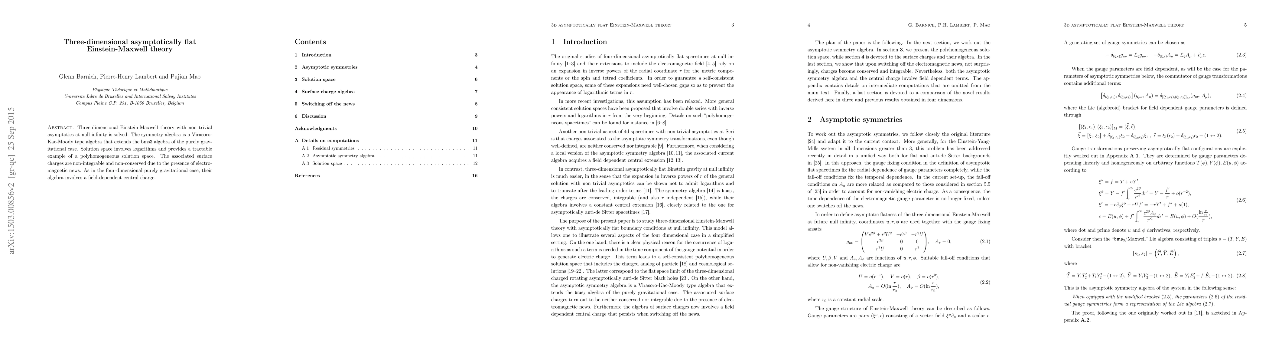 This paper solves three-dimensional Einstein-Maxwell theory with nontrivial asymptotics, revealing a Virasoro-Kac-Moody symmetry algebra. The solution space features polyhomogeneous structures and non-conserved, non-integrable surface charges due to electromagnetic effects.