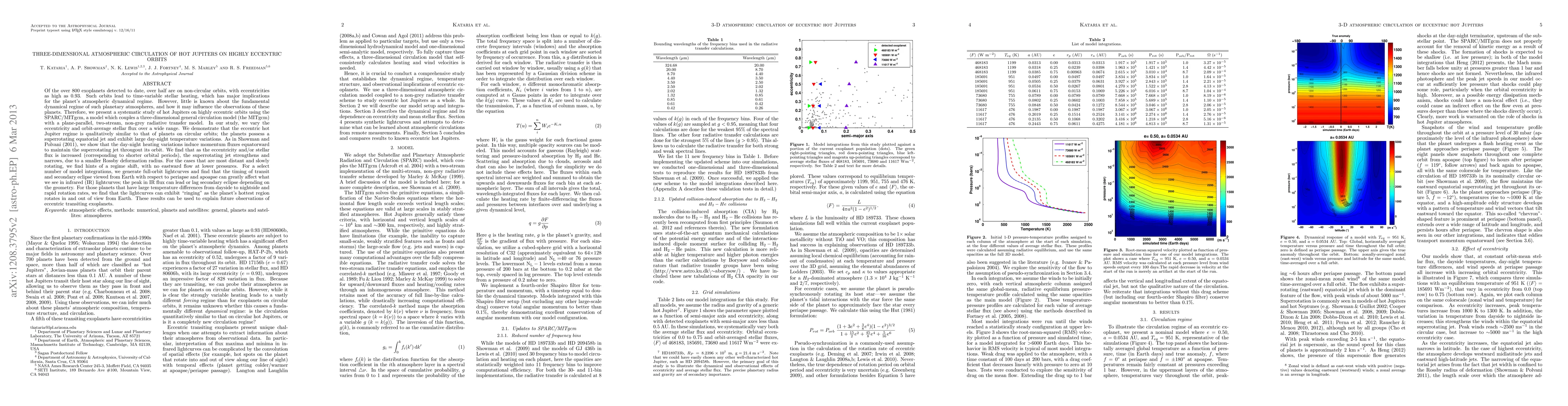 This study investigates the atmospheric dynamics of hot Jupiters on highly eccentric orbits using a three-dimensional general circulation model. It finds that these planets exhibit superrotating equatorial jets and significant day-night temperature variations, which influence the observed infrared lightcurves and can lead to "ringing" effects.