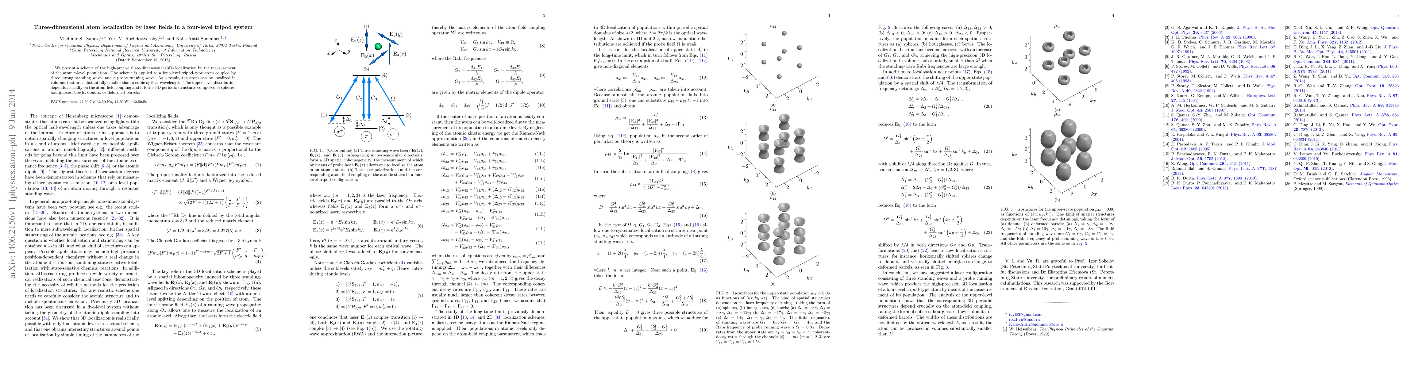 We present a scheme of the high-precise three-dimensional (3D) localization by the measurement of the atomic-level population. The scheme is applied to a four-level tripod-type atom coupled by three strong standing waves and a probe running wave. As a result, the atom can be localized in volumes that are substantially smaller than a cubic optical wavelength. The upper-level distribution depends crucially on the atom-field coupling and it forms 3D periodic structures composed of spheres, hourglasses, bowls, donuts, or deformed barrels.