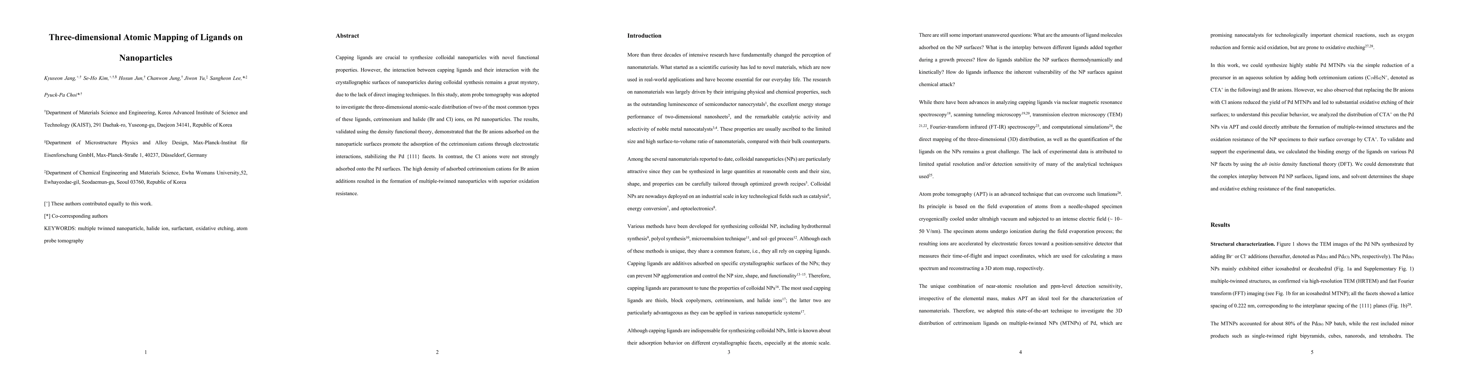 This study uses atom probe tomography to map the three-dimensional atomic distribution of cetrimonium and halide ligands on Pd nanoparticles, revealing that Br anions enhance cetrimonium cation adsorption via electrostatic interactions, stabilizing Pd {111} facets. Density functional theory validated these findings.