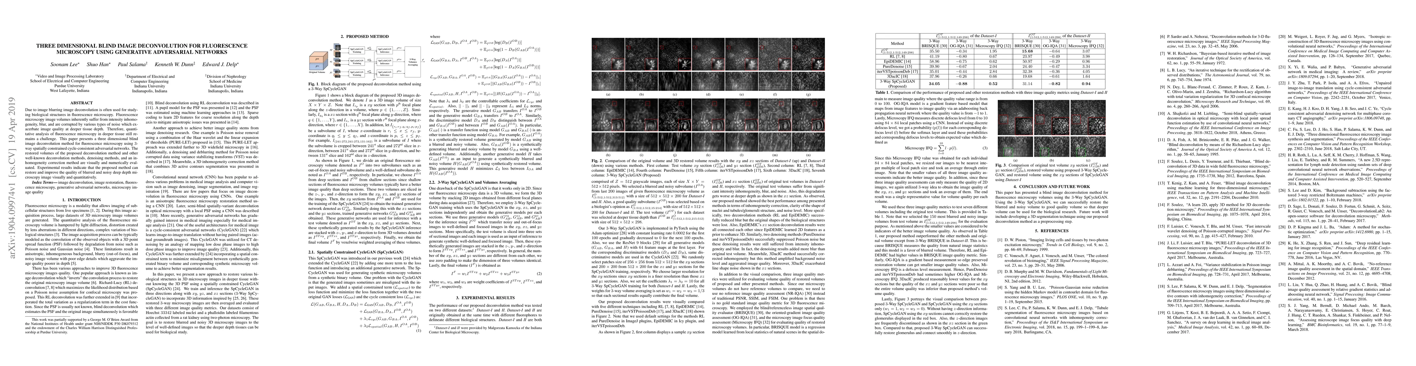 This paper proposes a 3D blind image deconvolution method for fluorescence microscopy using generative adversarial networks to enhance image quality in deep tissue. The method outperforms other deconvolution, denoising, and inhomogeneity correction techniques in both visual and quantitative evaluations.