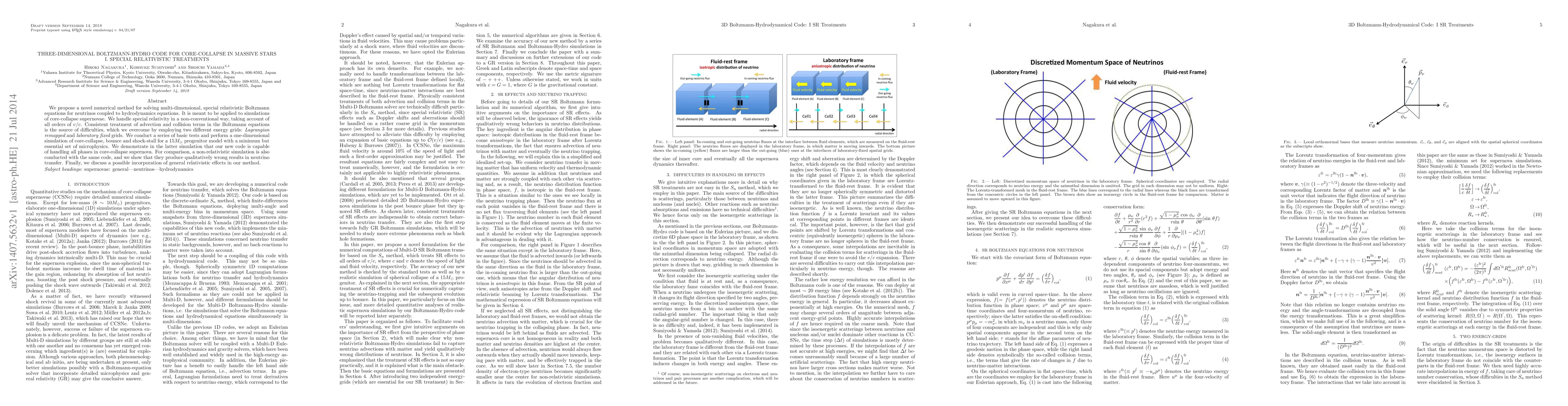 We propose a novel numerical method for solving multi-dimensional, special relativistic Boltzmann equations for neutrinos coupled to hydrodynamics equations. It is meant to be applied to simulations of core-collapse supernovae. We handle special relativity in a non-conventional way, taking account of all orders of v/c. Consistent treatment of advection and collision terms in the Boltzmann equations is the source of difficulties, which we overcome by employing two different energy grids: Lagrangian remapped and laboratory fixed grids. We conduct a series of basic tests and perform a one-dimensional simulation of core-collapse, bounce and shock-stall for a 15M_{sun} progenitor model with a minimum but essential set of microphysics. We demonstrate in the latter simulation that our new code is capable of handling all phases in core-collapse supernova. For comparison, a non-relativistic simulation is also conducted with the same code, and we show that they produce qualitatively wrong results in neutrino transfer. Finally, we discuss a possible incorporation of general relativistic effects in our method.