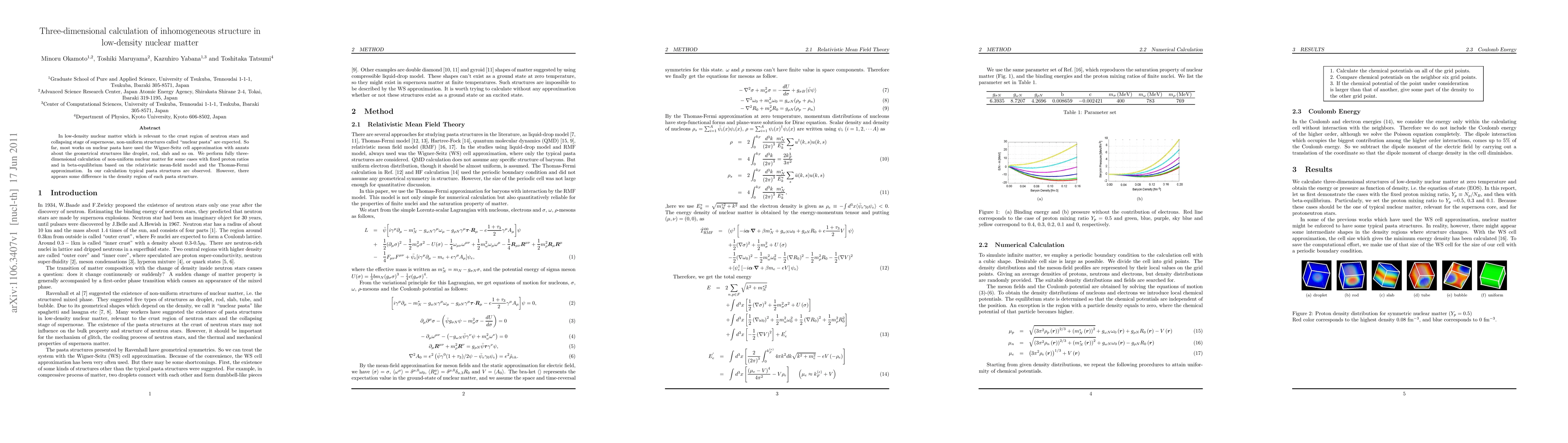 This paper presents a three-dimensional calculation of "nuclear pasta" structures in low-density nuclear matter using the relativistic mean-field model and Thomas-Fermi approximation. Unlike previous studies using the Wigner-Seitz approximation, this work reveals differences in the density regions of typical pasta structures.