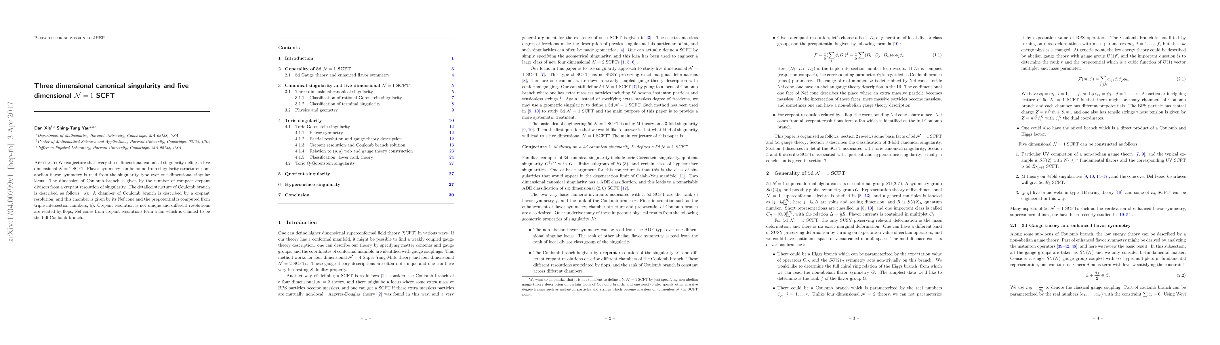 We conjecture that every three dimensional canonical singularity defines a five dimensional N=1 SCFT. Flavor symmetry can be found from singularity structure: non-abelian flavor symmetry is read from the singularity type over one dimensional singular locus. The dimension of Coulomb branch is given by the number of compact crepant divisors from a crepant resolution of singularity. The detailed structure of Coulomb branch is described as follows: a): A chamber of Coulomb branch is described by a crepant resolution, and this chamber is given by its Nef cone and the prepotential is computed from triple intersection numbers; b): Crepant resolution is not unique and different resolutions are related by flops; Nef cones from crepant resolutions form a fan which is claimed to be the full Coulomb branch.