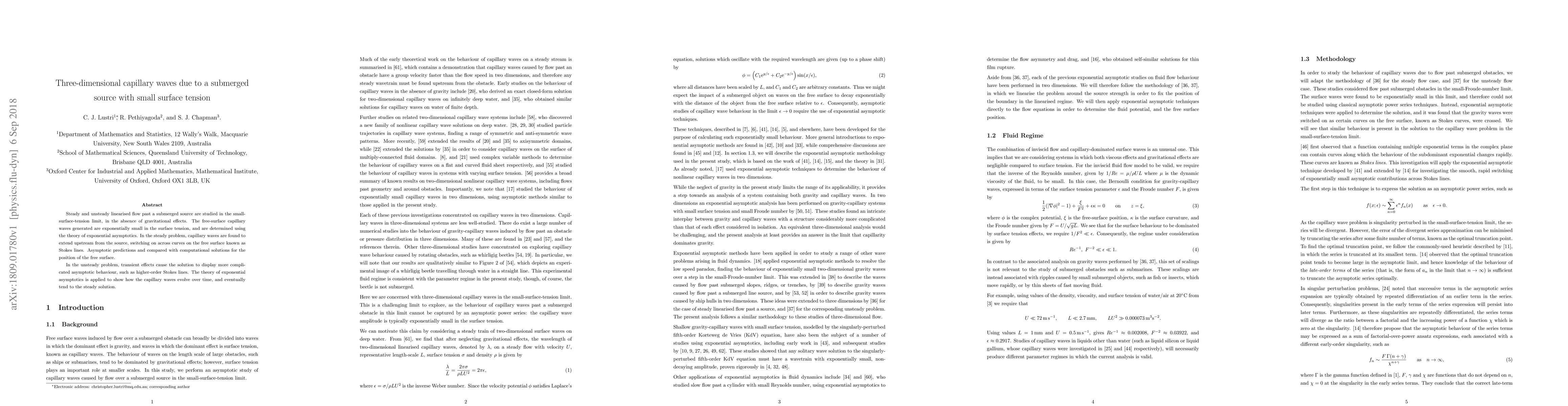 Steady and unsteady linearised flow past a submerged source are studied in the small-surface-tension limit, in the absence of gravitational effects. The free-surface capillary waves generated are exponentially small in the surface tension, and are determined using the theory of exponential asymptotics. In the steady problem, capillary waves are found to extend upstream from the source, switching on across curves on the free surface known as Stokes lines. Asymptotic predictions and compared with computational solutions for the position of the free surface. In the unsteady problem, transient effects cause the solution to display more complicated asymptotic behaviour, such as higher-order Stokes lines. The theory of exponential asymptotics is applied to show how the capillary waves evolve over time, and eventually tend to the steady solution.