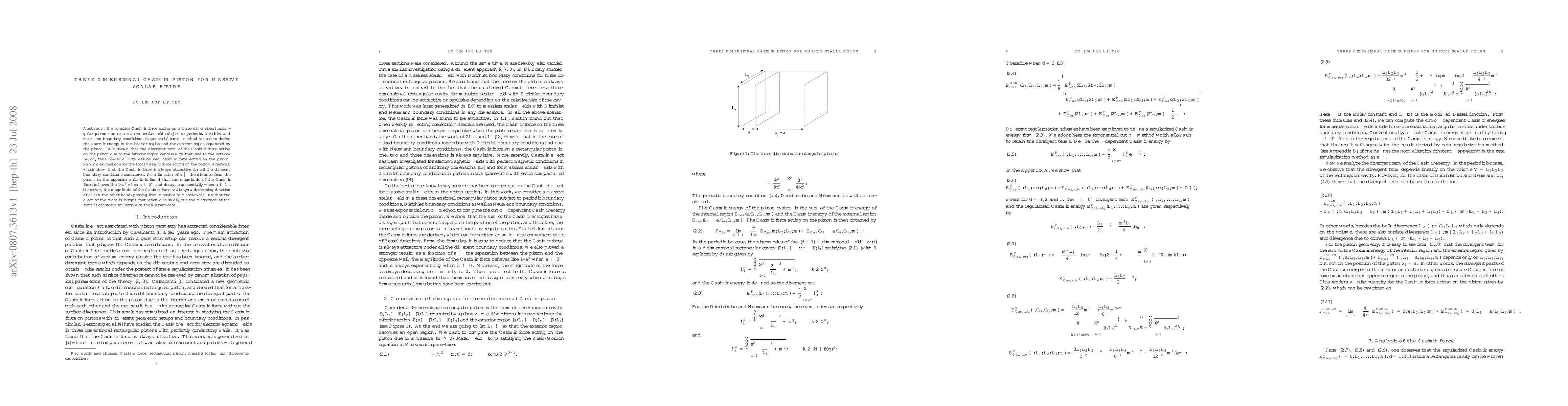 This paper investigates the Casimir force on a three-dimensional rectangular piston due to a massive scalar field under various boundary conditions. The study reveals that the Casimir force is always attractive and finite, with a magnitude that behaves as $1/a^4$ when the piston is close to the opposite wall and decays exponentially at larger distances.