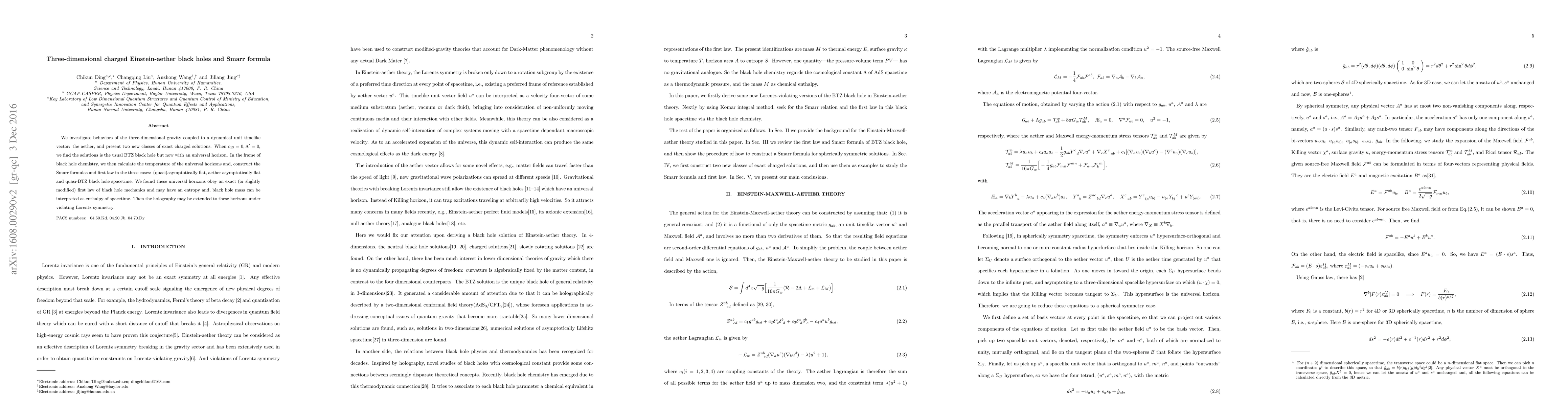 This paper explores three-dimensional gravity with a dynamical aether, presenting new charged black hole solutions. It derives the Smarr formula and first law for these solutions, suggesting that universal horizons may have entropy and that black hole mass can be seen as spacetime enthalpy, extending holography under Lorentz symmetry violation.