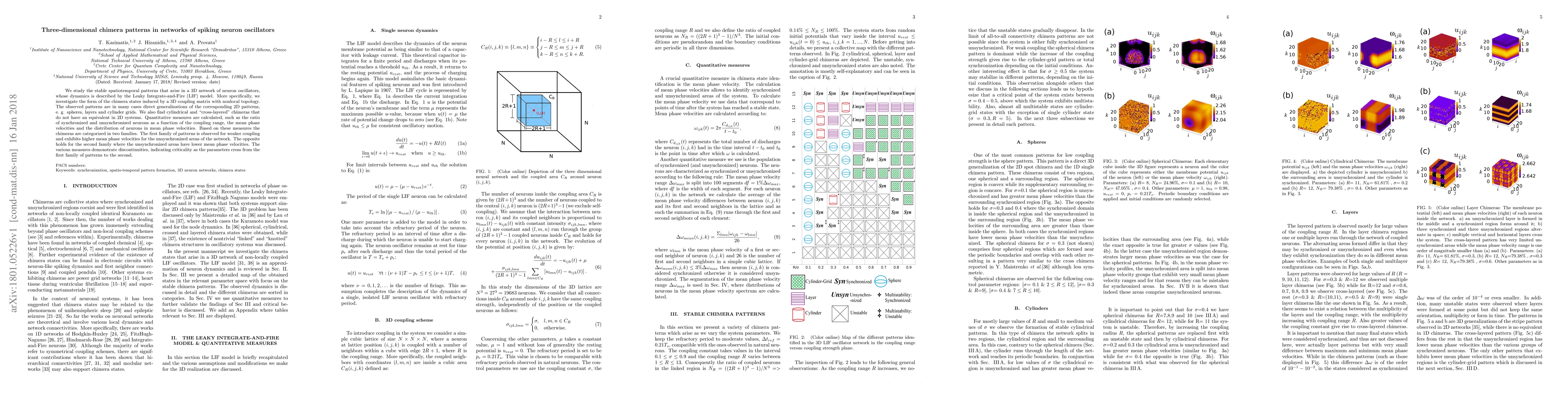 This paper investigates stable spatiotemporal chimera patterns in a 3D network of spiking neuron oscillators using the Leaky Integrate-and-Fire model, revealing new 3D chimera forms like cylindrical and cross-layered patterns. It categorizes these patterns based on phase velocity and synchronization ratios, showing critical transitions between two families of patterns with varying coupling strengths.