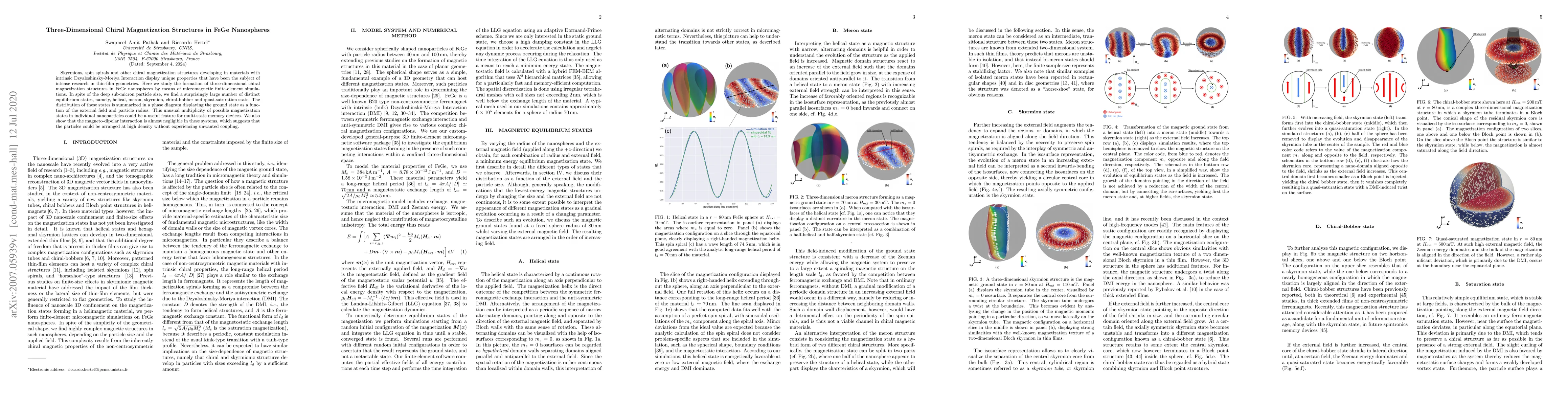 Skyrmions, spin spirals, and other chiral magnetization structures developing in materials with intrinsic Dzyaloshinsky-Moriya Interaction display unique properties that have been the subject of intense research in thin-film geometries. Here we study the formation of three-dimensional chiral magnetization structures in FeGe nanospheres by means of micromagnetic finite-element simulations. In spite of the deep sub-micron particle size, we find a surprisingly large number of distinct equilibrium states, namely, helical, meron, skyrmion, chiral-bobber and quasi-saturation state. The distribution of these states is summarized in a phase diagram displaying the ground state as a function of the external field and particle radius. This unusual multiplicity of possible magnetization states in individual nanoparticles could be a useful feature for multi-state memory devices. We also show that the magneto-dipolar interaction is almost negligible in these systems, which suggests that the particles could be arranged at high density without experiencing unwanted coupling.
