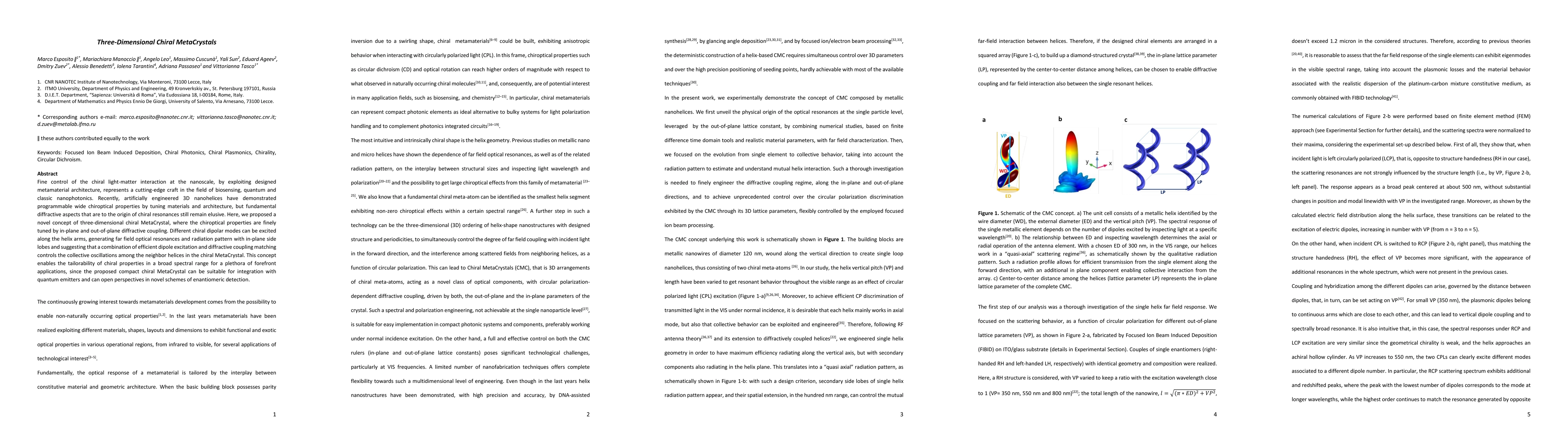 Fine control of the chiral light-matter interaction at the nanoscale, by exploiting designed metamaterial architecture, represents a cutting-edge craft in the field of biosensing, quantum and classic nanophotonics. Recently, artificially engineered 3D nanohelices have demonstrated programmable wide chiroptical properties by tuning materials and architecture, but fundamental diffractive aspects that are to the origin of chiral resonances still remain elusive. Here, we proposed a novel concept of three-dimensional chiral MetaCrystal, where the chiroptical properties are finely tuned by in-plane and out-of-plane diffractive coupling. Different chiral dipolar modes can be excited along the helix arms, generating far field optical resonances and radiation pattern with in-plane side lobes and suggesting that a combination of efficient dipole excitation and diffractive coupling matching controls the collective oscillations among the neighbor helices in the chiral MetaCrystal. This concept enables the tailorability of chiral properties in a broad spectral range for a plethora of forefront applications, since the proposed compact chiral MetaCrystal can be suitable for integration with quantum emitters and can open perspectives in novel schemes of enantiomeric detection.
