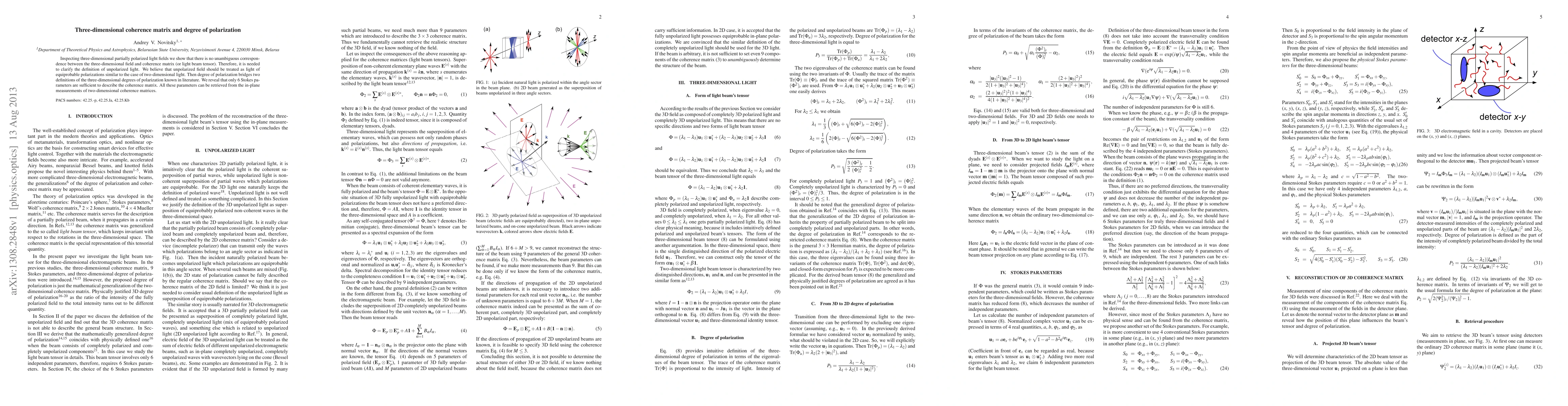 Inspecting three-dimensional partially polarized light fields we show that there is no unambiguous correspondence between the three-dimensional field and coherence matrix (or light beam tensor). Therefore, it is needed to clarify the definition of unpolarized light. We believe that unpolarized field should be treated as light of equiprobable polarizations similar to the case of two-dimensional light. Then degree of polarization bridges two definitions of the three-dimensional degrees of polarization known in literature. We reveal that only 6 Stokes parameters are sufficient to describe the coherence matrix. All these parameters can be retrieved from the in-plane measurements of two-dimensional coherence matrices.