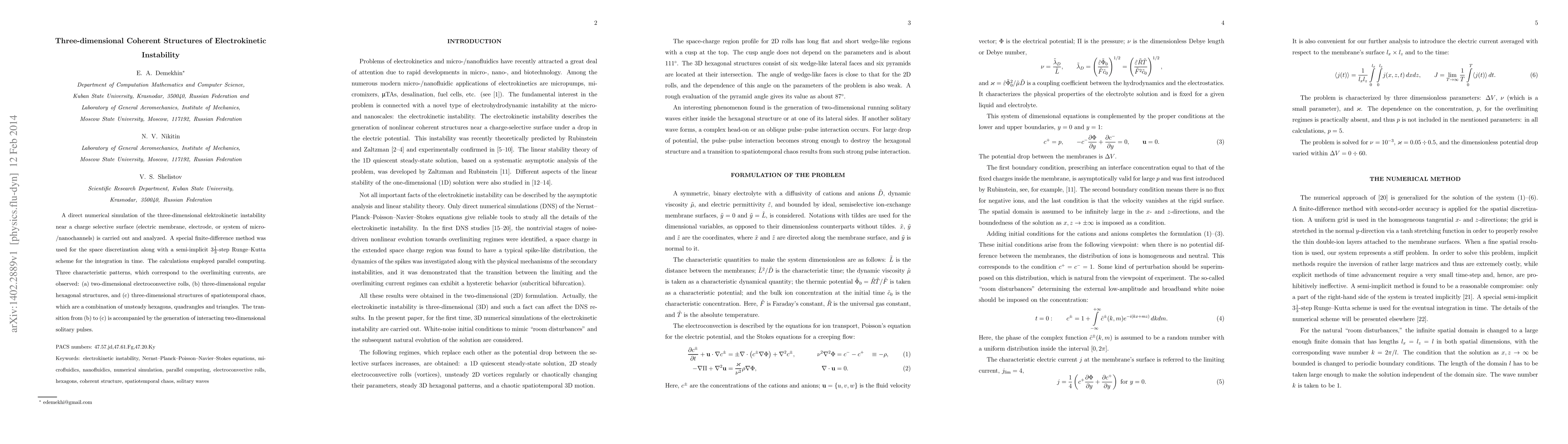 A direct numerical simulation of the three-dimensional electrokinetic instability was conducted using a special finite-difference method for space discretization and a semi-implicit 3.3-step Runge-Kutta scheme for time integration, employing parallel computing.