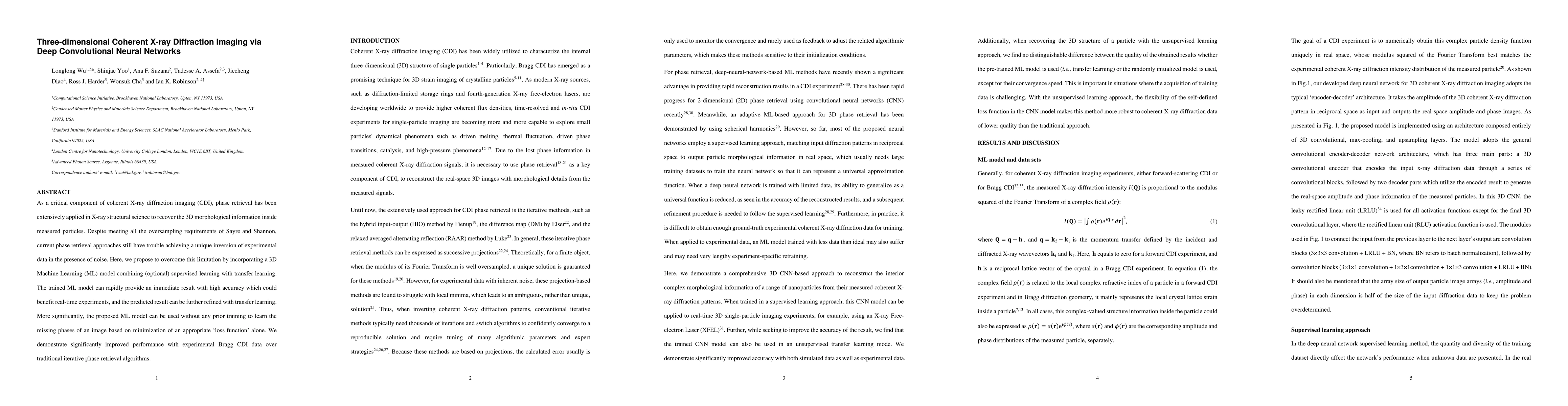 As a critical component of coherent X-ray diffraction imaging (CDI), phase retrieval has been extensively applied in X-ray structural science to recover the 3D morphological information inside measured particles. Despite meeting all the oversampling requirements of Sayre and Shannon, current phase retrieval approaches still have trouble achieving a unique inversion of experimental data in the presence of noise. Here, we propose to overcome this limitation by incorporating a 3D Machine Learning (ML) model combining (optional) supervised learning with transfer learning. The trained ML model can rapidly provide an immediate result with high accuracy which could benefit real-time experiments, and the predicted result can be further refined with transfer learning. More significantly, the proposed ML model can be used without any prior training to learn the missing phases of an image based on minimization of an appropriate 'loss function' alone. We demonstrate significantly improved performance with experimental Bragg CDI data over traditional iterative phase retrieval algorithms.