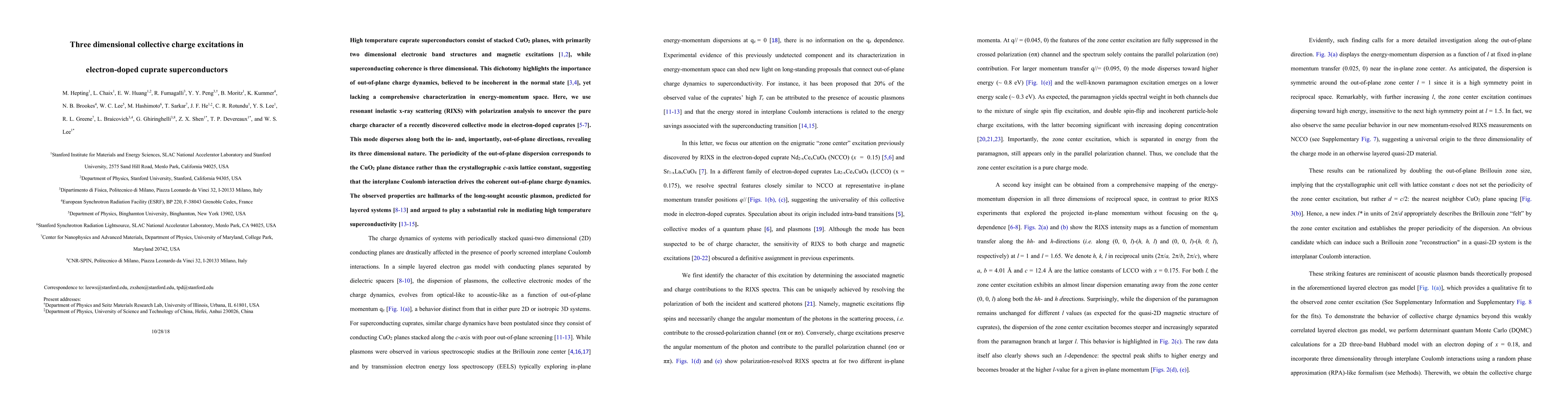 This study uses resonant inelastic x-ray scattering to reveal a three-dimensional collective charge excitation in electron-doped cuprate superconductors, showing its dispersion along both in-plane and out-of-plane directions, suggesting interplane Coulomb interactions drive this coherent charge dynamics akin to the acoustic plasmon.