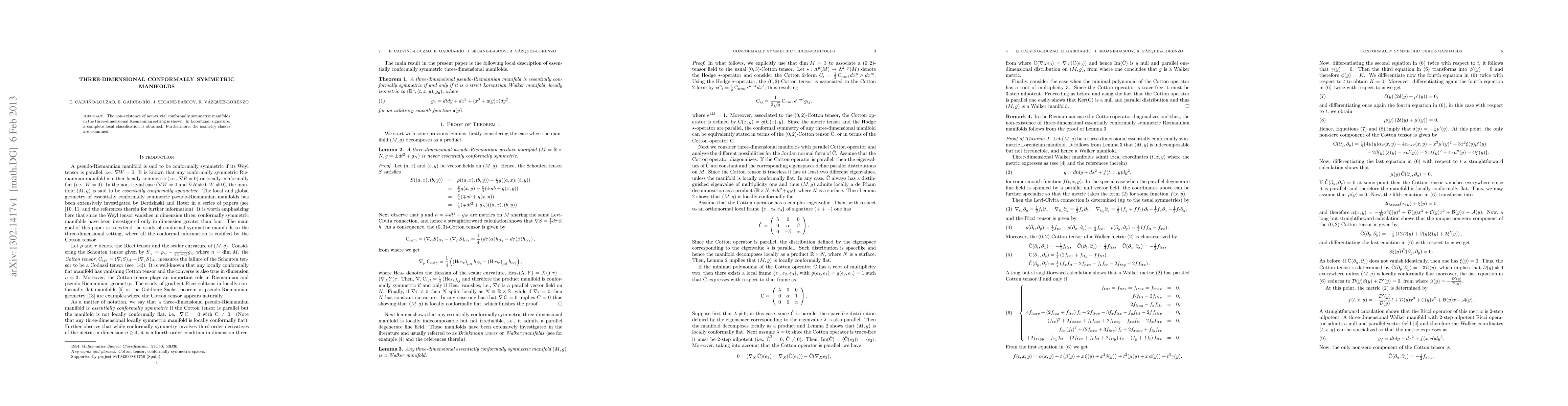Summary: This paper demonstrates that there are no non-trivial conformally symmetric manifolds in three-dimensional Riemannian geometry, and provides a complete local classification of such manifolds in the Lorentzian signature, along with an examination of their isometry classes.