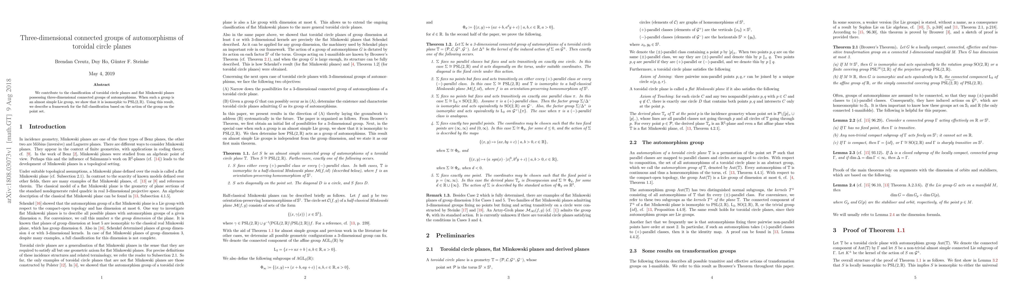 This research identifies that three-dimensional connected groups of automorphisms of toroidal circle planes, when being almost simple Lie groups, are isomorphic to PSL(2,ℝ). It lays out a classification framework for toroidal circle planes and flat Minkowski planes based on the group's action on the point set.