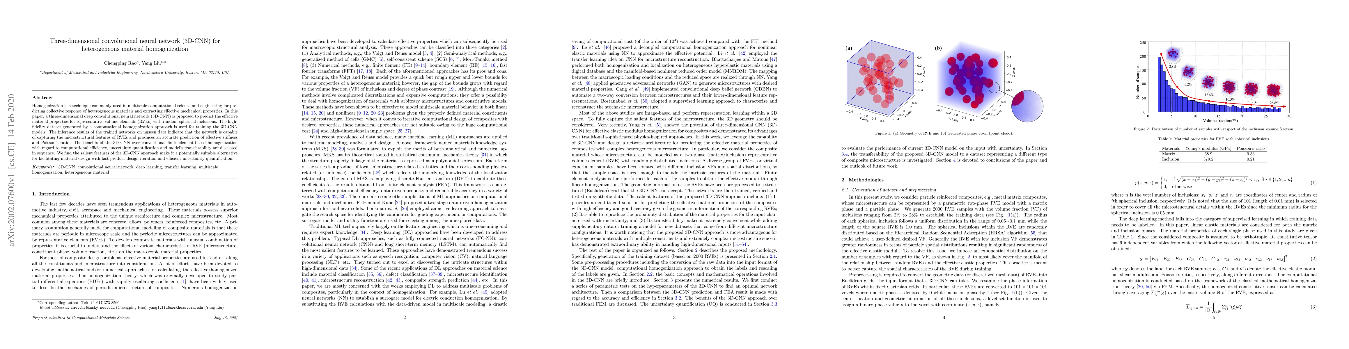 This paper proposes a 3D-CNN to predict effective material properties for heterogeneous materials with random spherical inclusions, trained using high-fidelity datasets from computational homogenization. The 3D-CNN demonstrates superior computational efficiency, uncertainty quantification, and transferability compared to conventional finite-element methods.