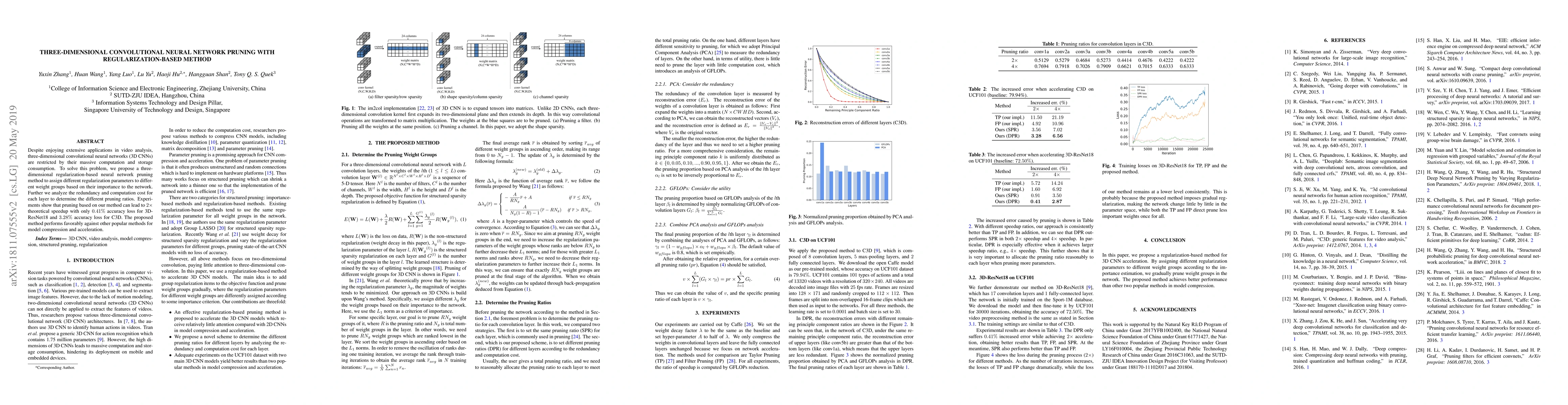 Despite enjoying extensive applications in video analysis, three-dimensional convolutional neural networks (3D CNNs)are restricted by their massive computation and storage consumption. To solve this problem, we propose a threedimensional regularization-based neural network pruning method to assign different regularization parameters to different weight groups based on their importance to the network. Further we analyze the redundancy and computation cost for each layer to determine the different pruning ratios. Experiments show that pruning based on our method can lead to 2x theoretical speedup with only 0.41% accuracy loss for 3DResNet18 and 3.28% accuracy loss for C3D. The proposed method performs favorably against other popular methods for model compression and acceleration.