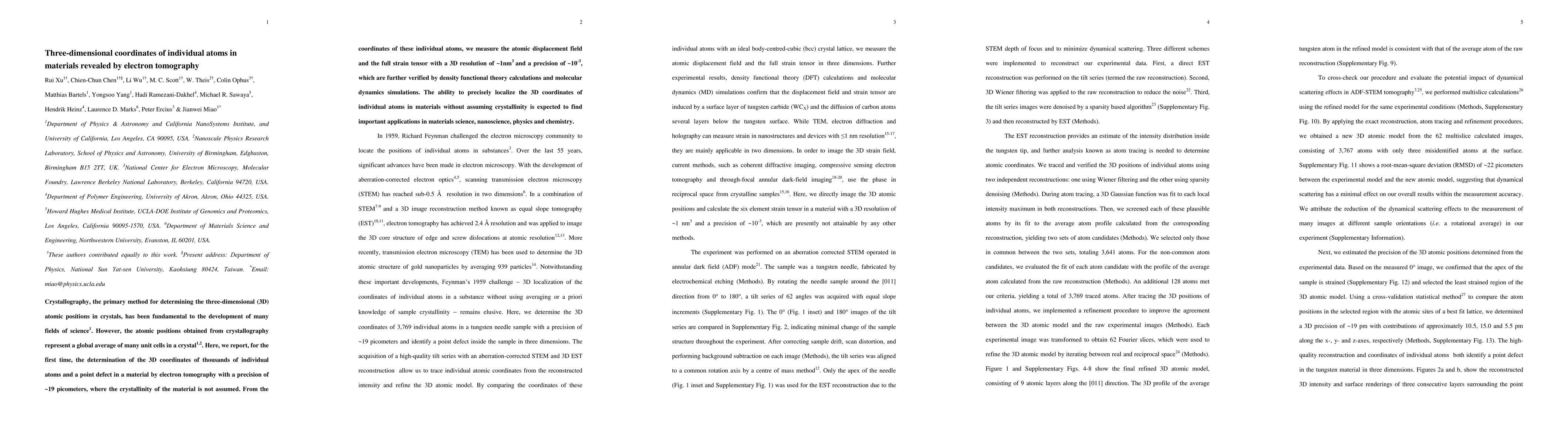 This paper reports the first use of electron tomography to determine the three-dimensional coordinates of individual atoms and defects in materials, achieving a precision of ~19 picometers without assuming crystallinity. The method enables the measurement of atomic displacement fields and the full strain tensor with a resolution of ~1nm^3 and precision of ~10^-3, with verification through computational simulations.