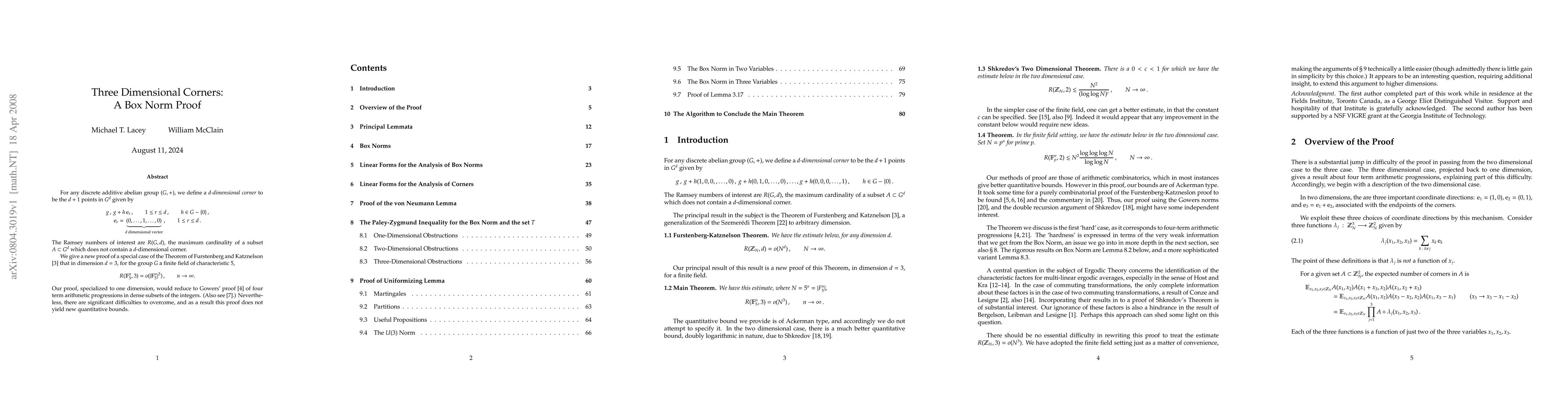 In an additive group (G,+), a three-dimensional corner is the four points g, g+d(1,0,0), g+d(0,1,0), g+d(0,0,1), where g is in G^3, and d is a non-zero element of G. The Ramsey number of interest is R_3(G) the maximal cardinality of a subset of G^3 that does not contain a three-dimensional corner. Furstenberg and Katznelson have shown R_3(Z_N) is little-o of N^3, and in fact the corresponding result holds in all dimensions, a result that is a far reaching extension of the Szemeredi Theorem. We give a new proof of the finite field version of this fact, a proof that is a common generalization of the Gowers proof of Szemeredi's Theorem for four term progressions, and the result of Shkredov on two-dimensional corners. The principal tool are the Gowers Box Norms.