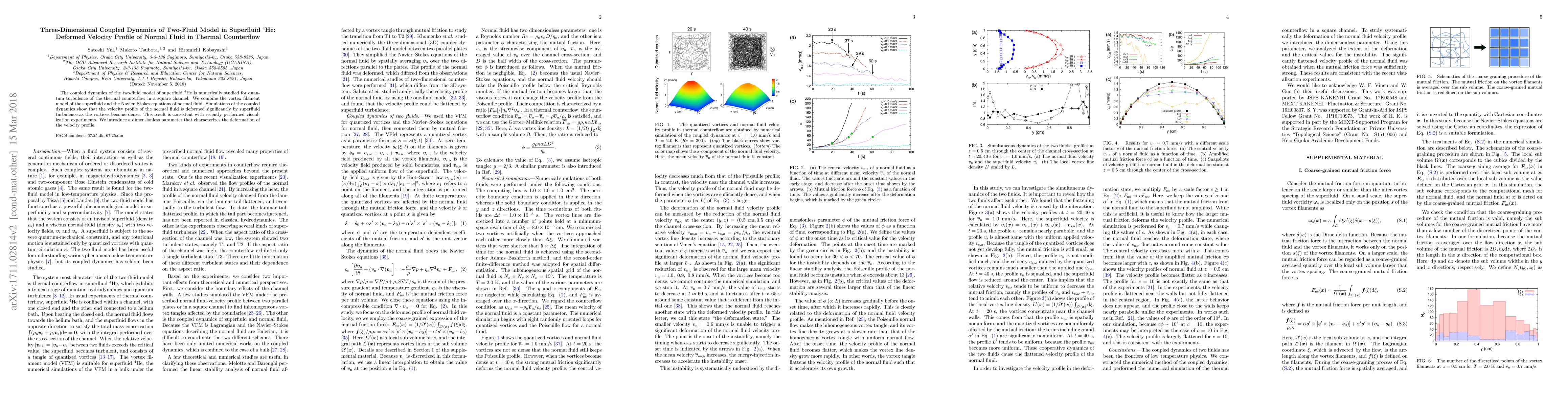 This paper numerically investigates the coupled dynamics of superfluid $^4$He using a two-fluid model, focusing on quantum turbulence in thermal counterflow within a square channel. The study reveals significant deformation of the normal fluid's velocity profile due to dense superfluid vortices, consistent with experimental observations, and introduces a new dimensionless parameter to quantify this deformation.