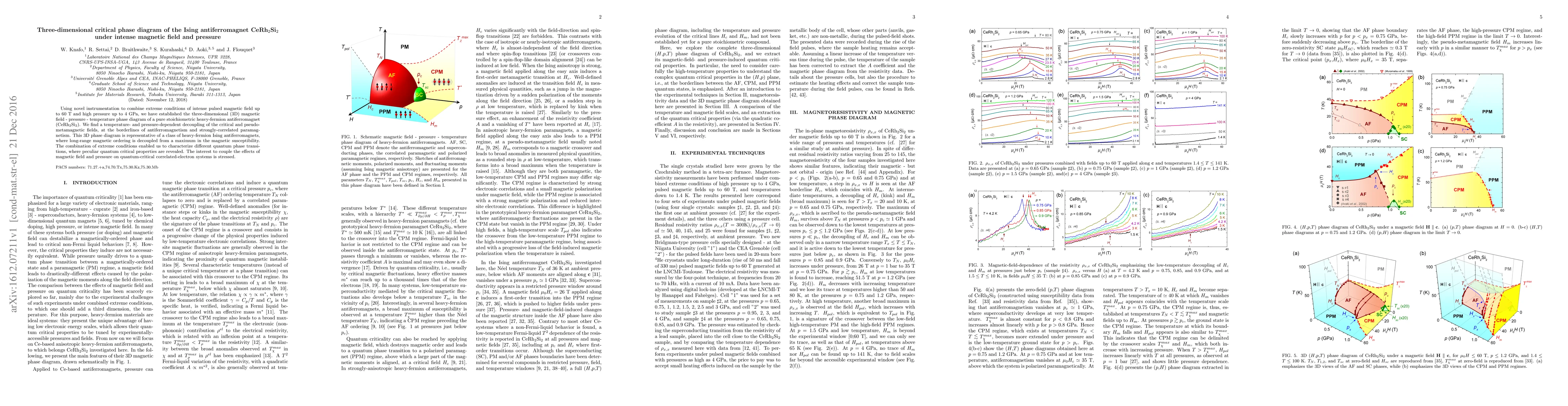 Using novel instrumentation to combine extreme conditions of intense pulsed magnetic field up to 60~T and high pressure up to 4~GPa, we have established the three-dimensional (3D) magnetic field - pressure - temperature phase diagram of a pure stoichiometric heavy-fermion antiferromagnet (CeRh$_2$Si$_2$). We find a temperature- and pressure-dependent decoupling of the critical and pseudo-metamagnetic fields, at the borderlines of antiferromagnetism and strongly-correlated paramagnetism. This 3D phase diagram is representative of a class of heavy-fermion Ising antiferromagnets, where long-range magnetic ordering is decoupled from a maximum in the magnetic susceptibility. The combination of extreme conditions enabled us to characterize different quantum phase transitions, where peculiar quantum critical properties are revealed. The interest to couple the effects of magnetic field and pressure on quantum-critical correlated-electron systems is stressed.