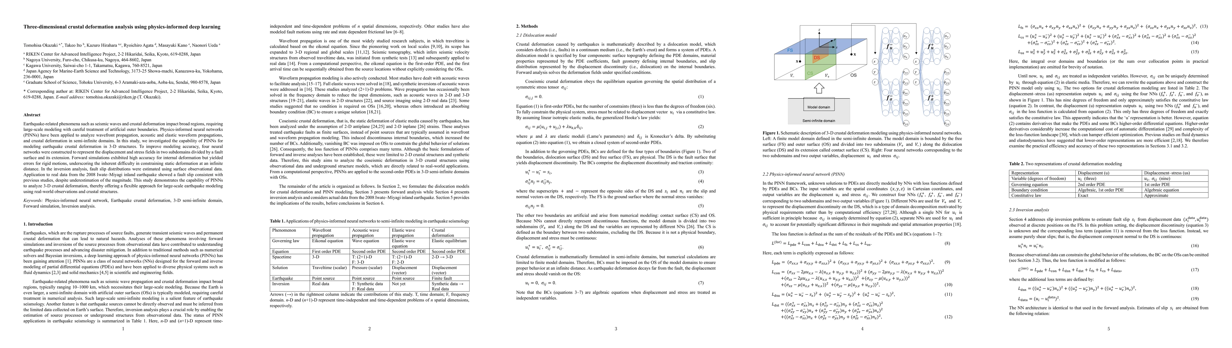 Earthquake-related phenomena such as seismic waves and crustal deformation impact broad regions, requiring large-scale modeling with careful treatment of artificial outer boundaries. Physics-informed neural networks (PINNs) have been applied to analyze wavefront propagation, acoustic and elastic waveform propagations, and crustal deformation in semi-infinite domains. In this study, we investigated the capability of PINNs for modeling earthquake crustal deformation in 3-D structures. To improve modeling accuracy, four neural networks were constructed to represent the displacement and stress fields in two subdomains divided by a fault surface and its extension. Forward simulations exhibited high accuracy for internal deformation but yielded errors for rigid motions, underscoring the inherent difficulty in constraining static deformation at an infinite distance. In the inversion analysis, fault slip distributions were estimated using surface observational data. Application to real data from the 2008 Iwate-Miyagi inland earthquake showed a fault slip consistent with previous studies, despite underestimation of the magnitude. This study demonstrates the capability of PINNs to analyze 3-D crustal deformation, thereby offering a flexible approach for large-scale earthquake modeling using real-world observations and crustal structures.
