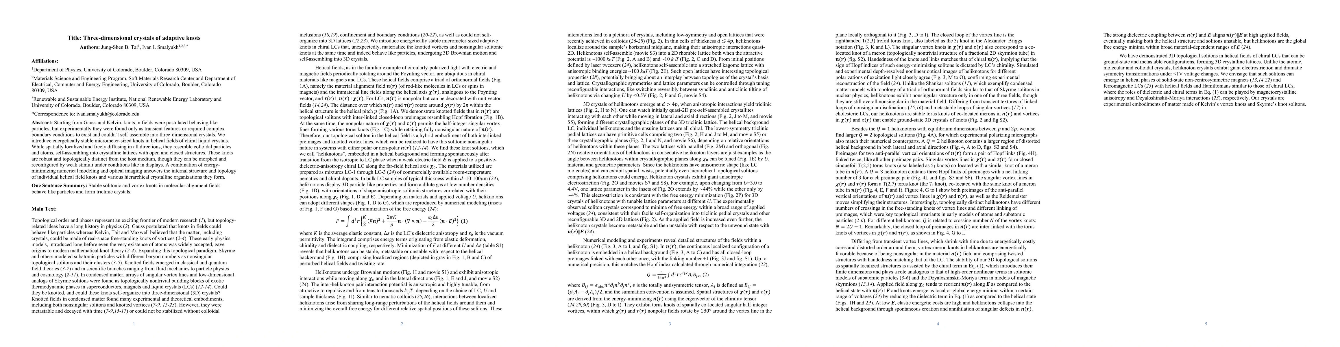 This research introduces stable, micrometer-sized knots in chiral liquid crystals that self-assemble into three-dimensional crystalline lattices, resembling colloidal particles and atoms. These knots are topologically distinct, robust, and can be reconfigured by weak stimuli, offering potential applications in displays.