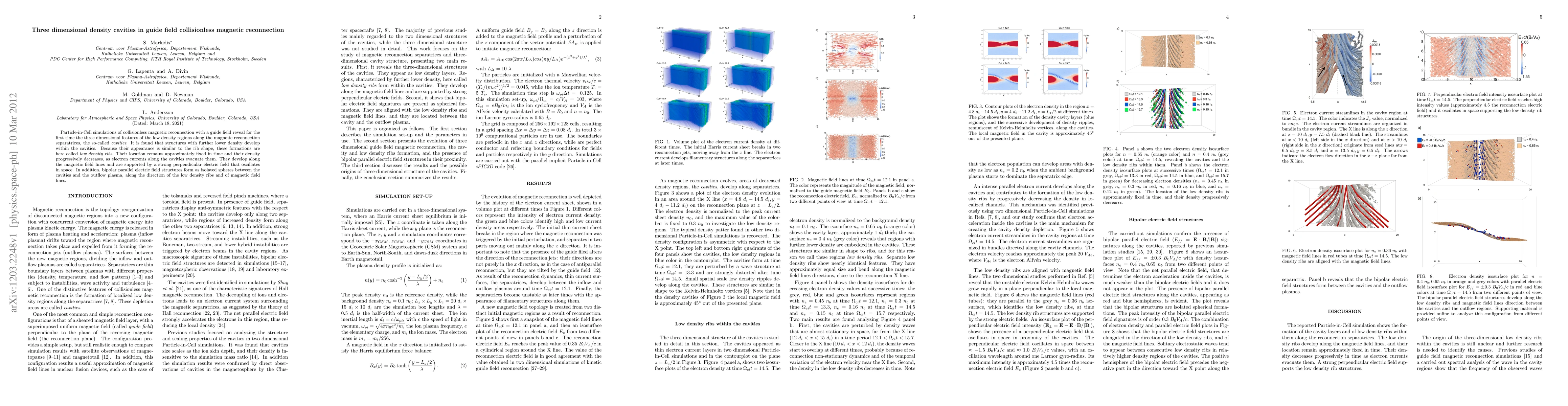 Particle-in-Cell simulations uncover three-dimensional density cavities and "low density ribs" in guide field collisionless magnetic reconnection, with the ribs supported by a strong perpendicular electric field and bipolar parallel electric fields forming between cavities and outflow plasma.