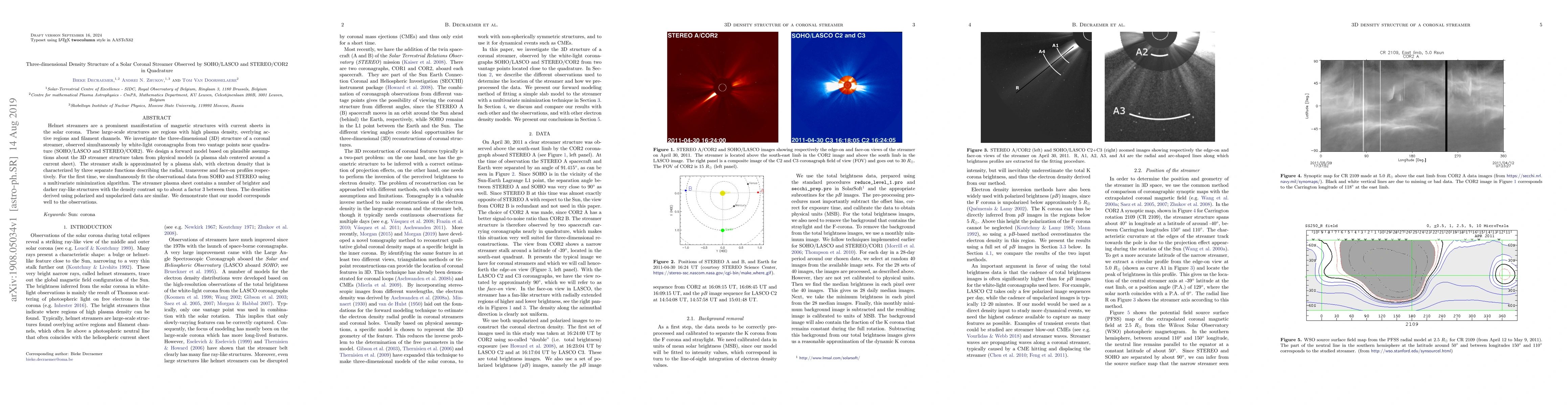 This paper investigates the three-dimensional structure of a solar coronal streamer using observations from SOHO/LASCO and STEREO/COR2. The study models the streamer as a plasma slab centered around a current sheet and fits observational data to derive density profiles, revealing ray-like structures with density contrasts up to a factor of three.