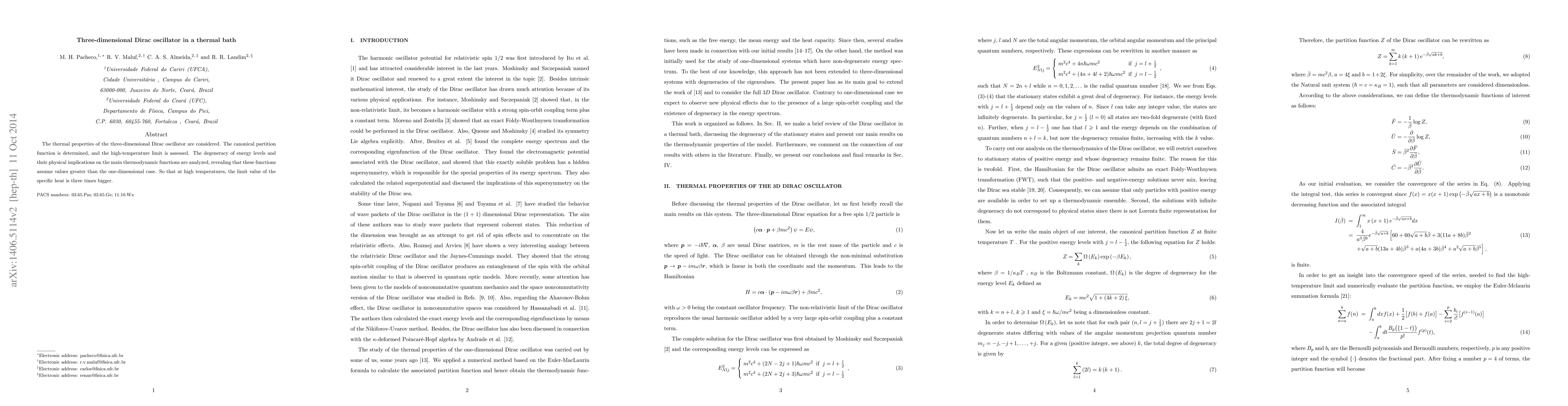 The research analyzes the three-dimensional Dirac oscillator in a thermal bath, determining the canonical partition function and assessing its high-temperature limit. It examines the degeneracy of energy levels and their implications for main thermodynamic functions.