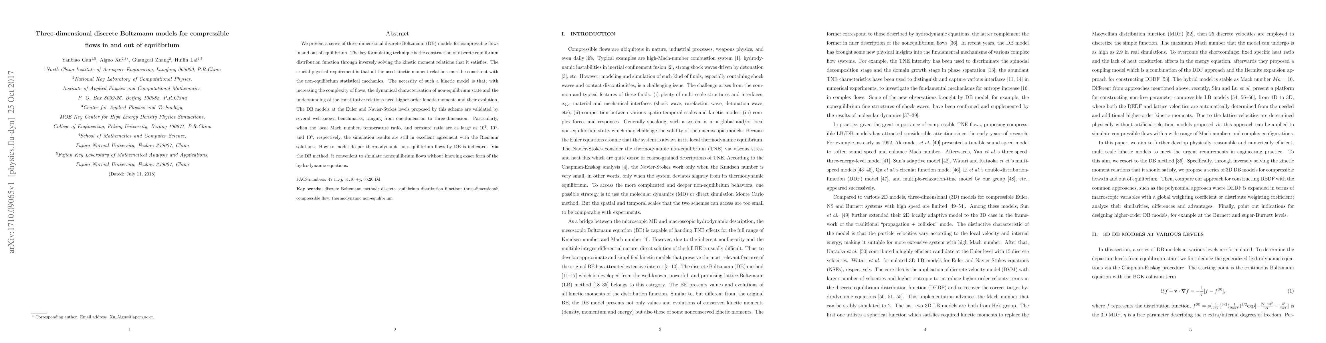 This paper introduces three-dimensional discrete Boltzmann models for compressible flows in and out of equilibrium, constructed by solving kinetic moment relations to define the equilibrium distribution function. The models are validated against benchmarks, demonstrating accuracy even under extreme conditions, and suggest a method to simulate complex nonequilibrium flows.