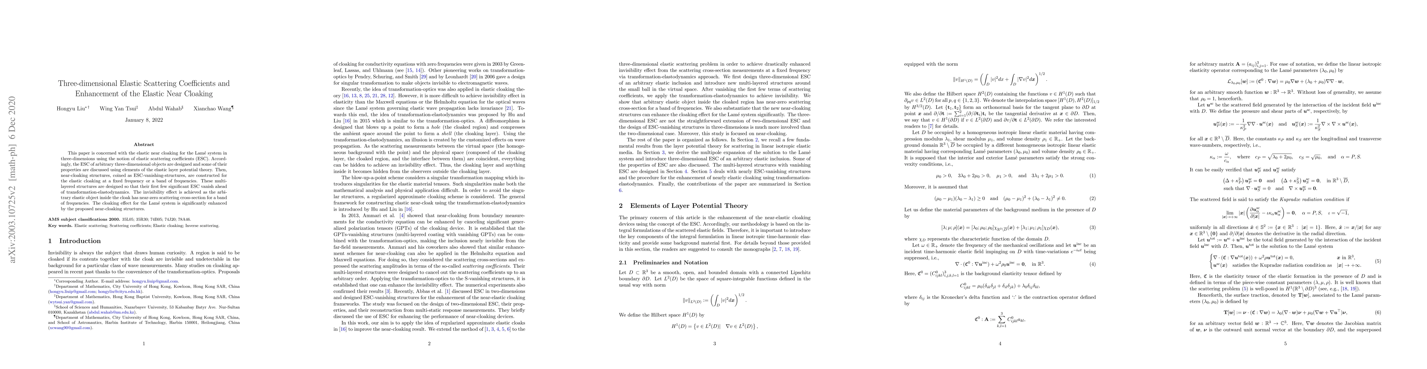 This paper develops three-dimensional elastic scattering coefficients (ESC) for near cloaking in the Lam\'e system, constructing multi-layered ESC-vanishing-structures to achieve invisibility by minimizing scattering at specific frequencies or bands. The proposed near-cloaking structures significantly enhance the elastic cloaking effect.